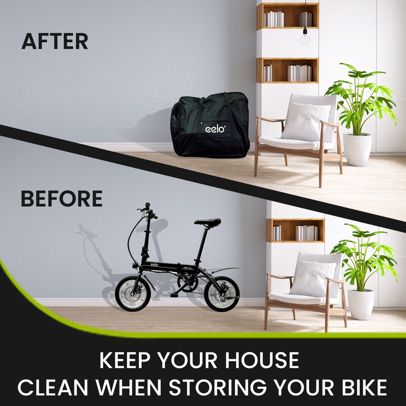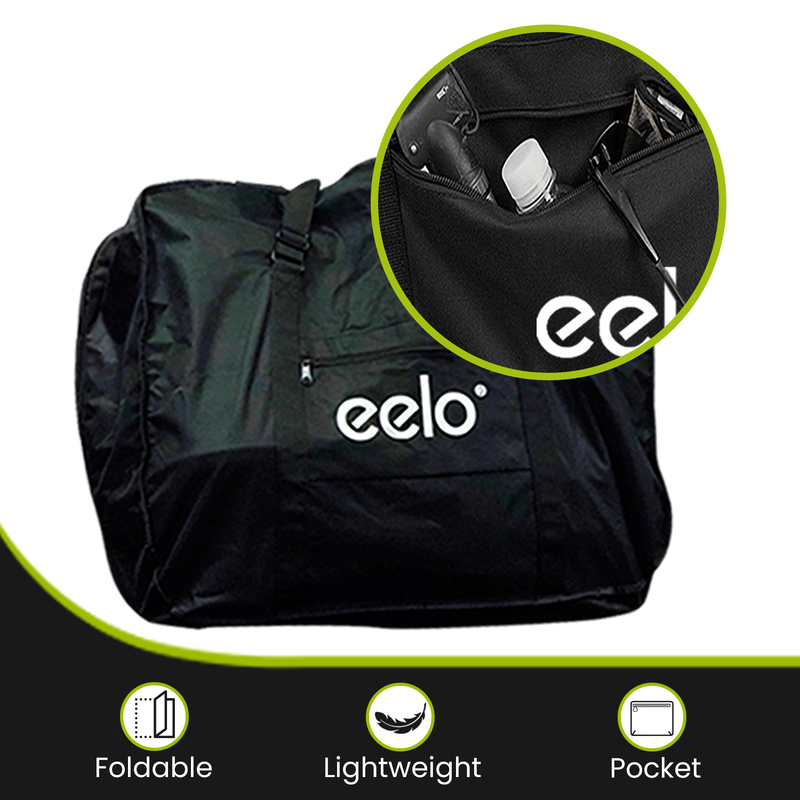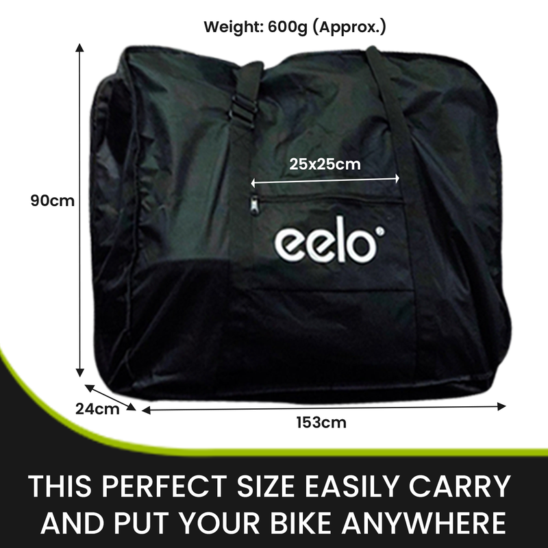 The eelo 1885 transport bag is designed with a large storage capacity to fit a folding bike or folding electric bike and your cycling accessories. The storage design and built-in compartments prevent accessories and items from moving around and damaging. Designed to be durable and water resistant. Simply put the bicycle into the carry bag and zip up.