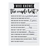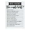 Who knows the happy couple the best? This fun game is perfect for bridal showers, as an engagement party activity or for co-ed bachelor/bachelorette parties. Each player answers a series of questions about the couple to determine who knows them the best. The winner is whoever gets the most correct answers on the card! Cardstock. 5" x 7"