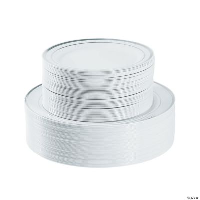 Bulk 100 Ct. Premium White Plastic Plates with Silver Trim