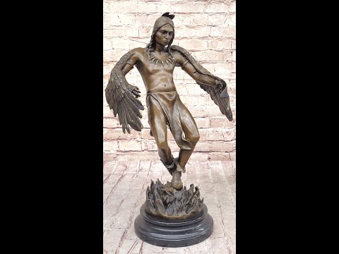 Step into the world of Native American spirituality and marvel at the captivating beauty of our bronze sculpture, "Winged Spirit." This extraordinary piece depicts a Native American man, deeply connected to the power of bird wings, embracing his inner desire to soar freely. With only a cloth adorning his lower body, his gaze is fixed downward, symbolizing his longing for flight and a spiritual connection to the heavens above.