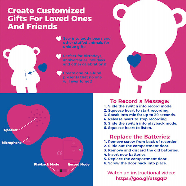 The Inventiv sound recording module is built into a premium quality heart shaped casing. This is our new version with upgraded sound quality for louder and more clear playback; it can easily be heard through fabric/material.