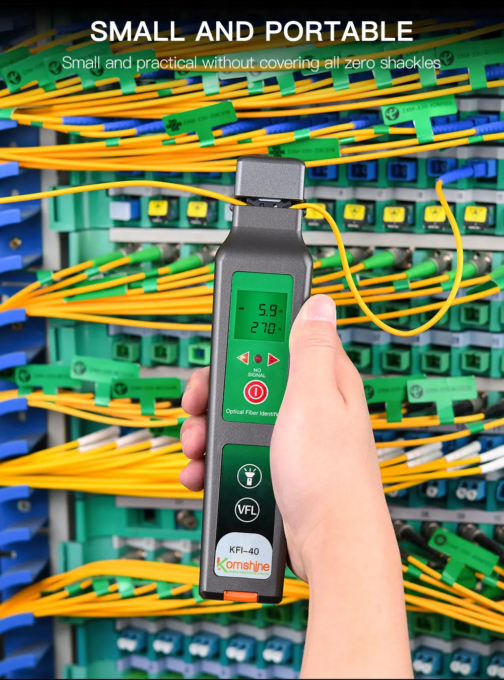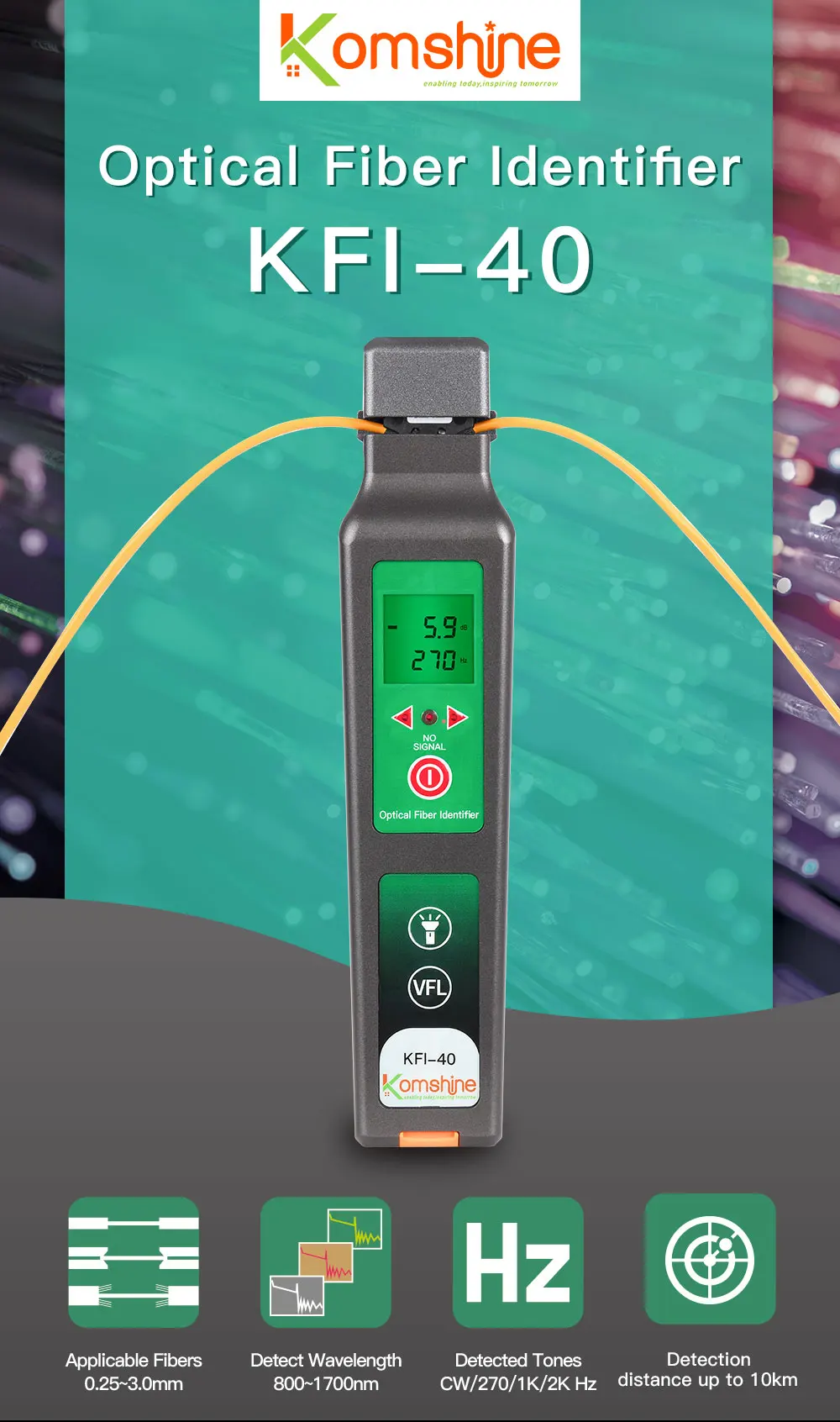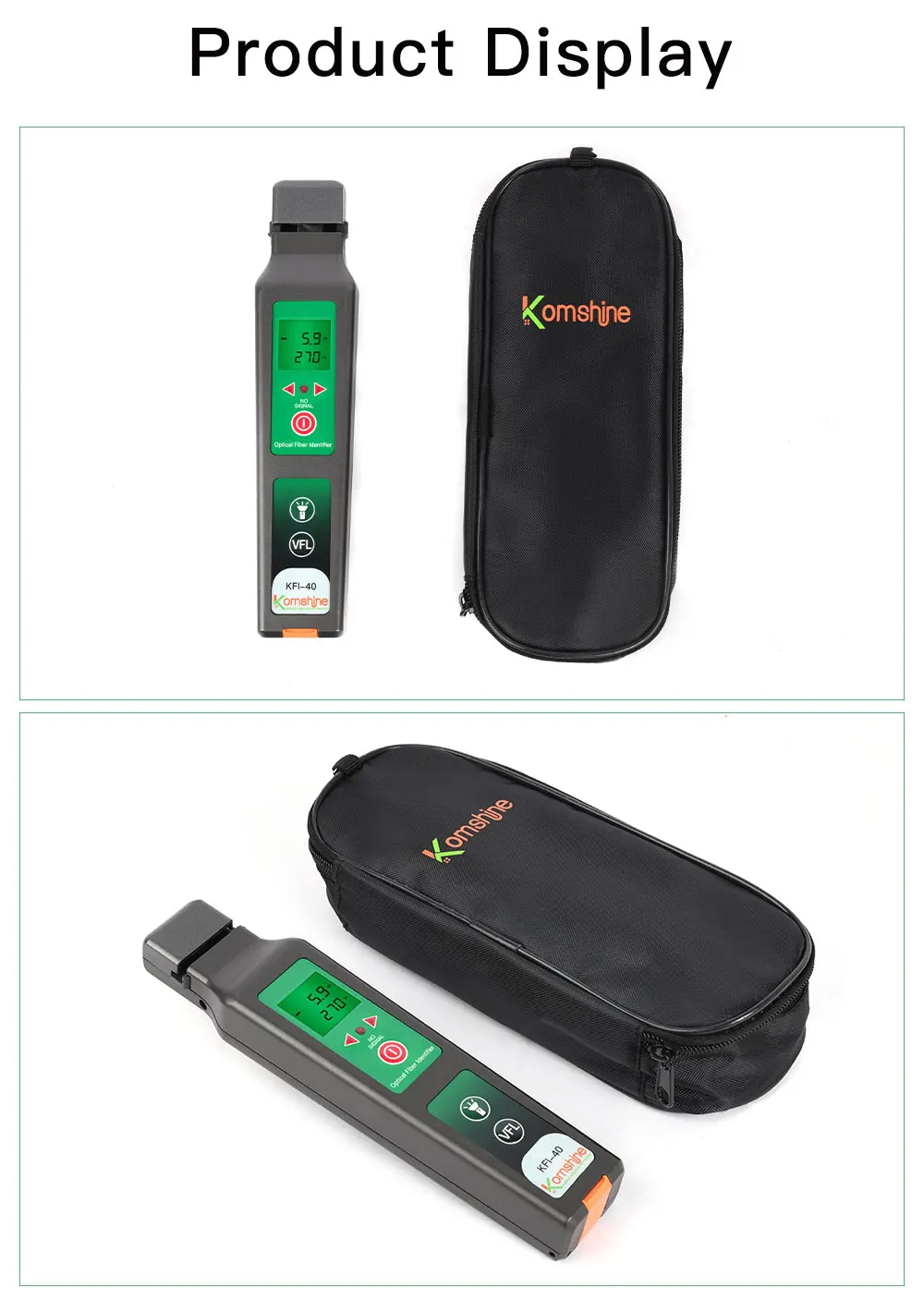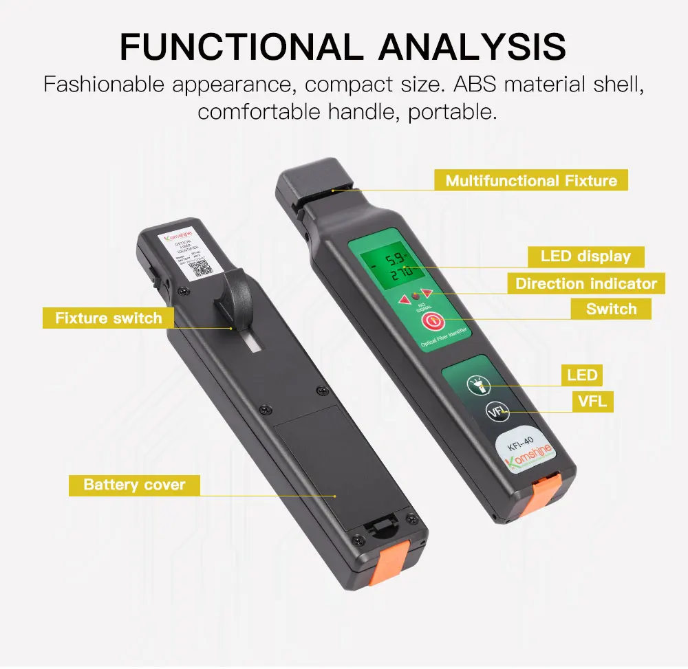 Upgraded high accuracy fiber identifier KFI-40 integrates VFL and LED lighting function,It is one of the necessary tools for fiber maintenance.Fiber identifier can detect any position of the single mode and multi mode fiber.