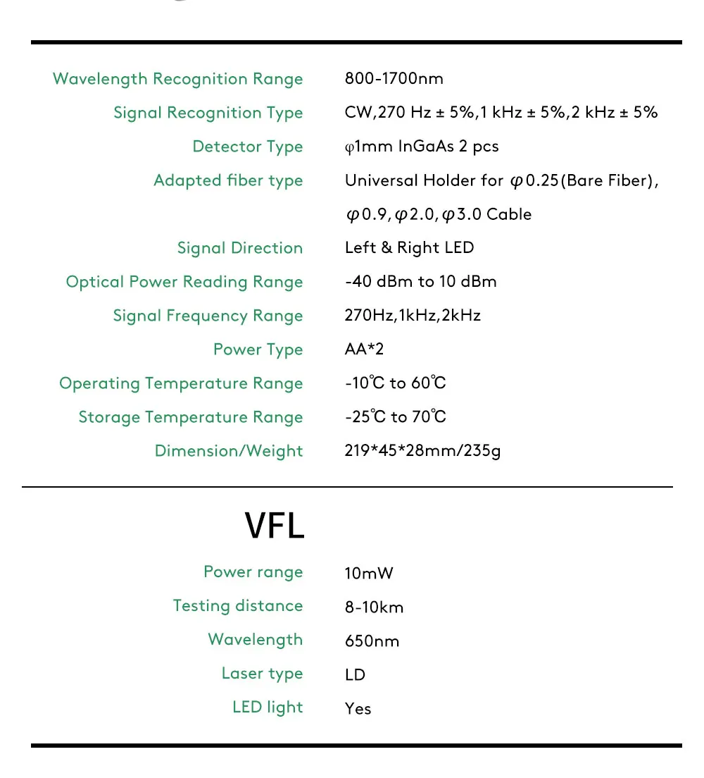 With the fiber identifier to identify the fiber on the line, you can identify the fiber power and 3 kinds of signal frequencies, and there will be a buzzer sound when identifying the frequency.Display the signal direction via left and right direction light and to make prompt judgment.VFL adopt 2.5mm universal connector and output power is up to 10mW,It can detect fiber break or bending problems within 10km,and it supports pulse and continuous wavelength operation.And it equipped with LED light,convenient for you to work in the dark.