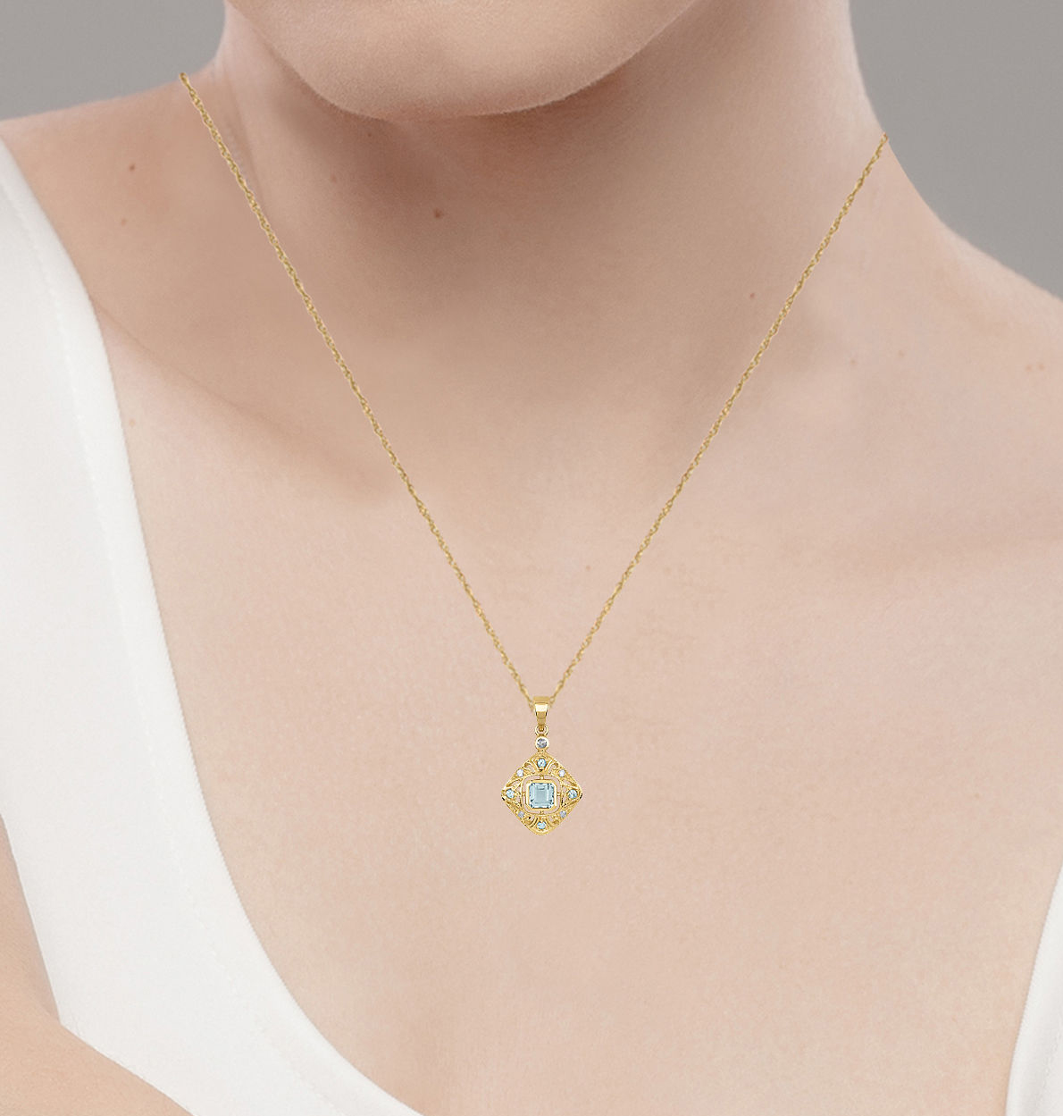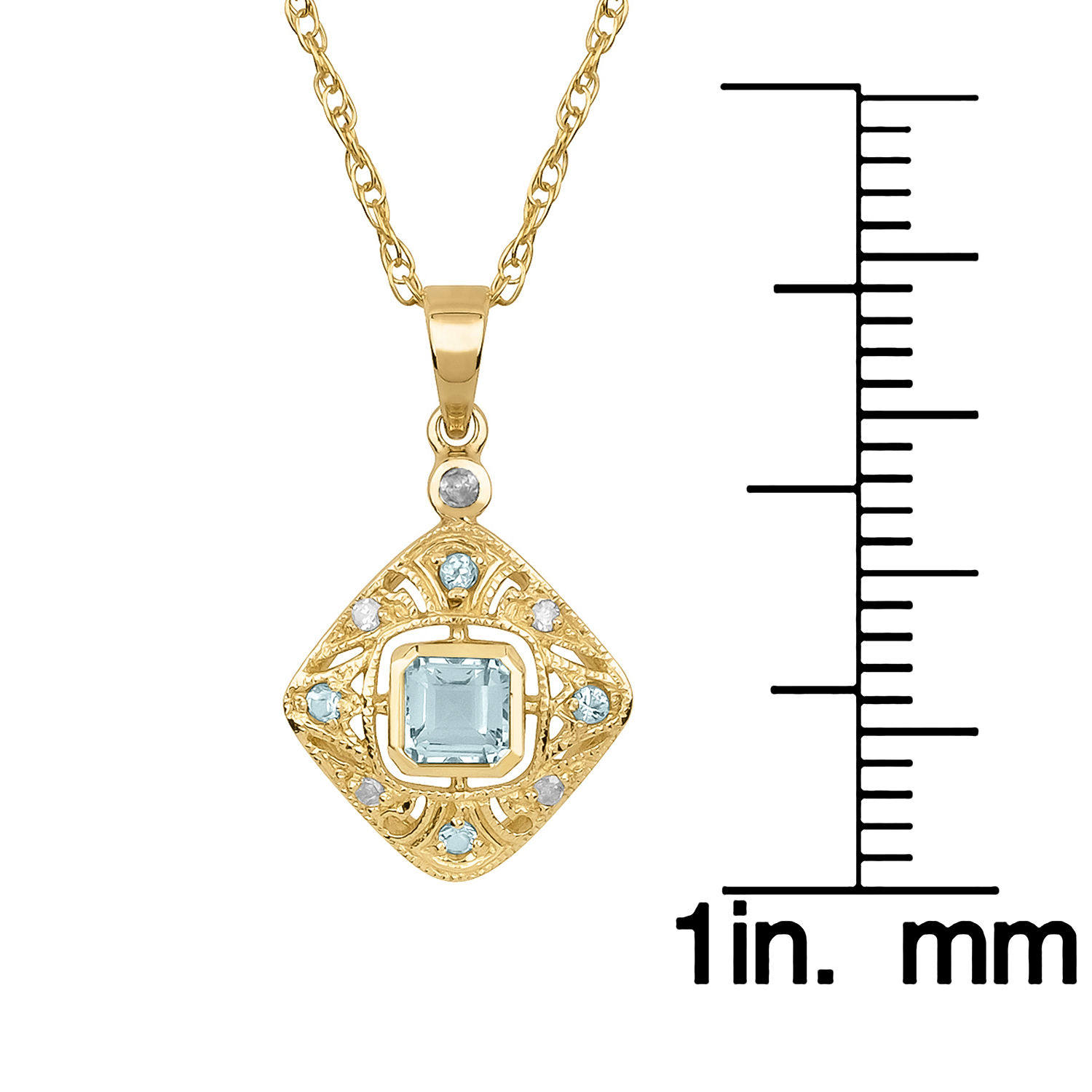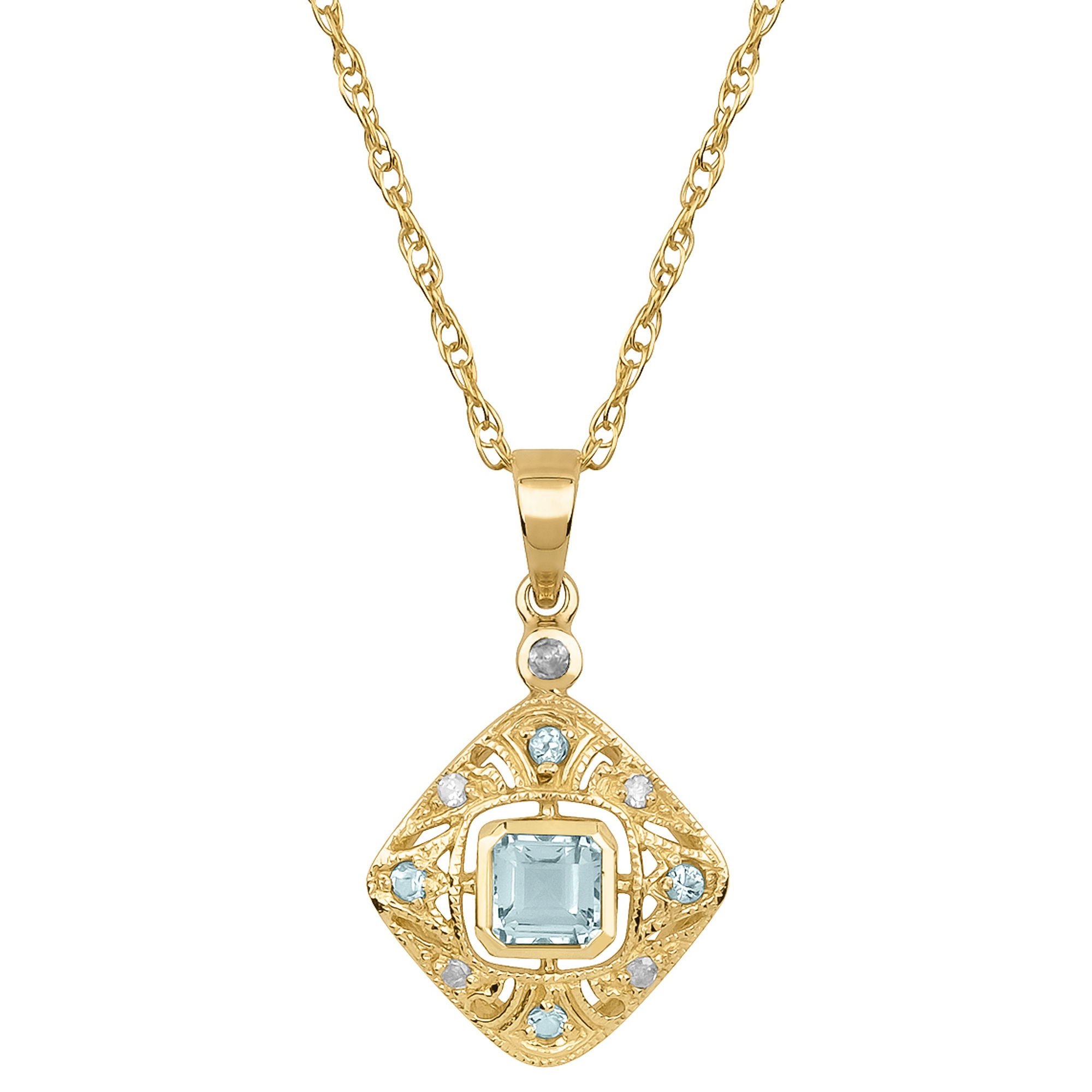 Enhance any wardrobe with this beautiful Blue Topaz and diamond pendant necklace. This necklace showcases a genuine natural 4mm cushion-cut Blue Topaz and round Blue Topaz accent stones. The vintage inspired design features milgrain with pave-set diamond side stones. Crafted of 10k yellow gold and hanging from an 18 inch rope chain, this piece is a wonderful addition to your jewelry collection.