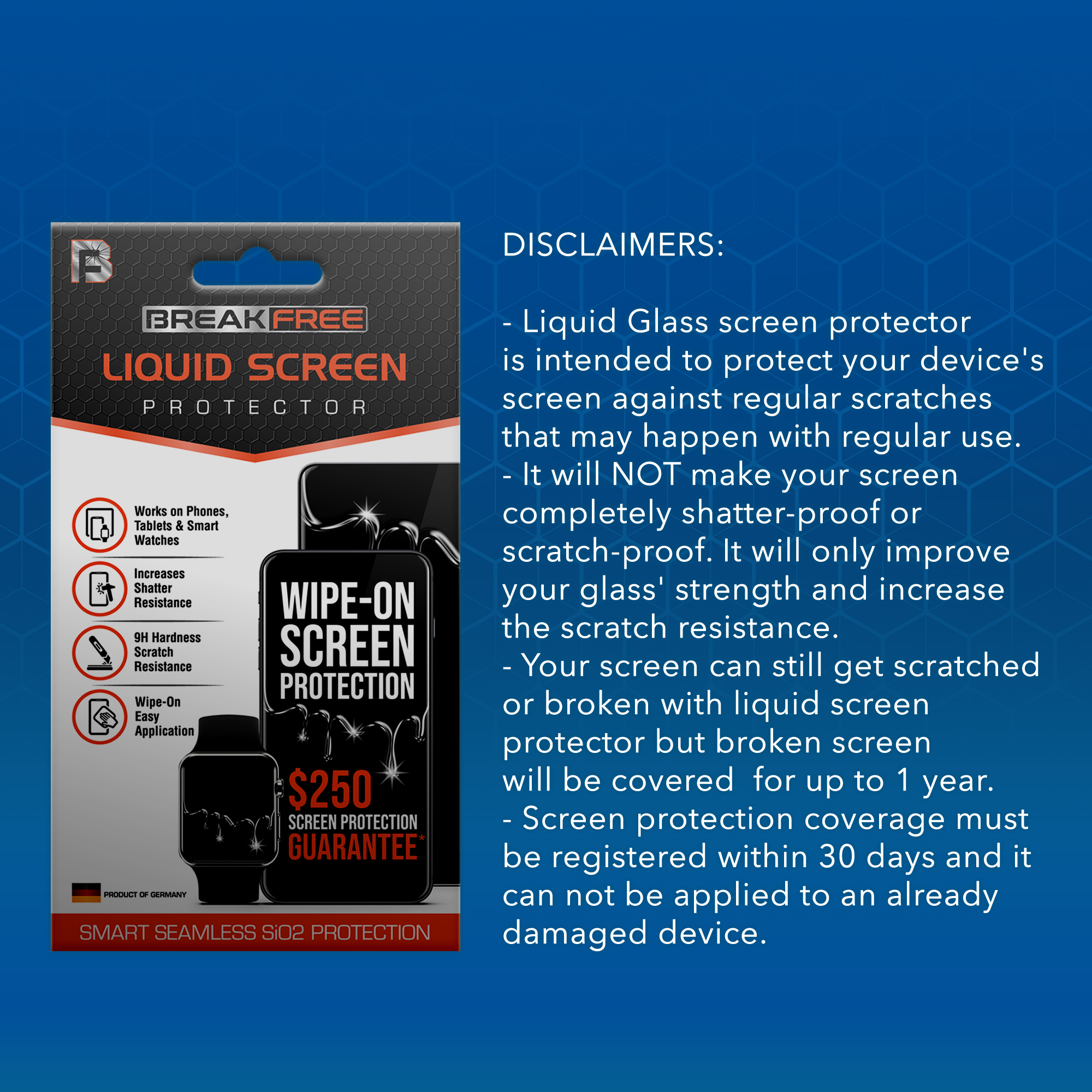 BREAK FREE Liquid Screen Protection was formulated in Germany utilizing cutting-edge Nano SiO2 technology to coat and protect all types of mobile device screens seamlessly. Silica Dioxide (SiO2) is mainly nanoparticles of glass suspended in a transparent liquid coating. Once applied, BREAKFREE creates a seamless, invisible protective layer of liquid glass that bonds to any glass device screen at a microscopic level. The results are significant; with an increase of the screen hardness to 9H, BREAK FREE will help reduce screen surface scratches and screen breaks due to accidental drops. Liquid screen protector is intended to protect your device's screen against regular scratches that may happen with regular use. It will NOT make your screen completely shatter-proof or scratch-proof. It will only improve your glass' strength and increase the scratch resistance. Your screen can still get scratched or broken with a liquid glass screen protector. You must register your device within 30 days from purchase for the guarantee to be valid. No exceptions can be made.