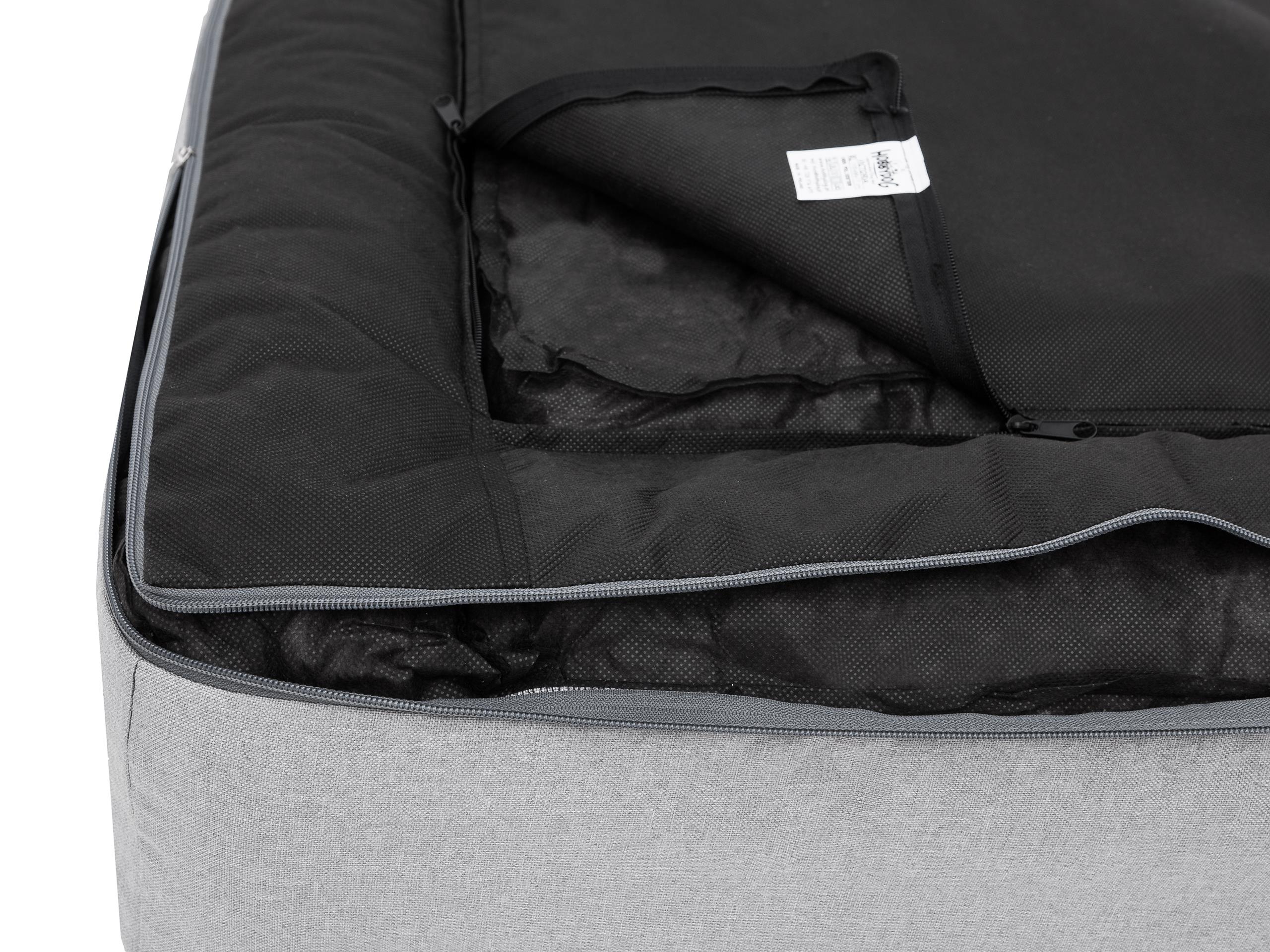Das Material hat eine erhöhte Beständigkeit gegen Kratzer und Feuchtigkeit. Darüber hinaus ist es leicht zu reinigen. Das Bett ist mit Einsätzen aus gemahlenem Polyurethanschaum gefüllt. Sie füllen das Bett fest. (Füllung aus 4 teilen: 3x Walzen + 1x Matratze). Dank dessen ist es sehr bequem und breitet sich gleichzeitig nicht seitlich aus. Es ist einteilig und hat einen abnehmbaren Bezug am Reißverschluss. Auf diese Weise können Sie das Bezug selbst waschen.