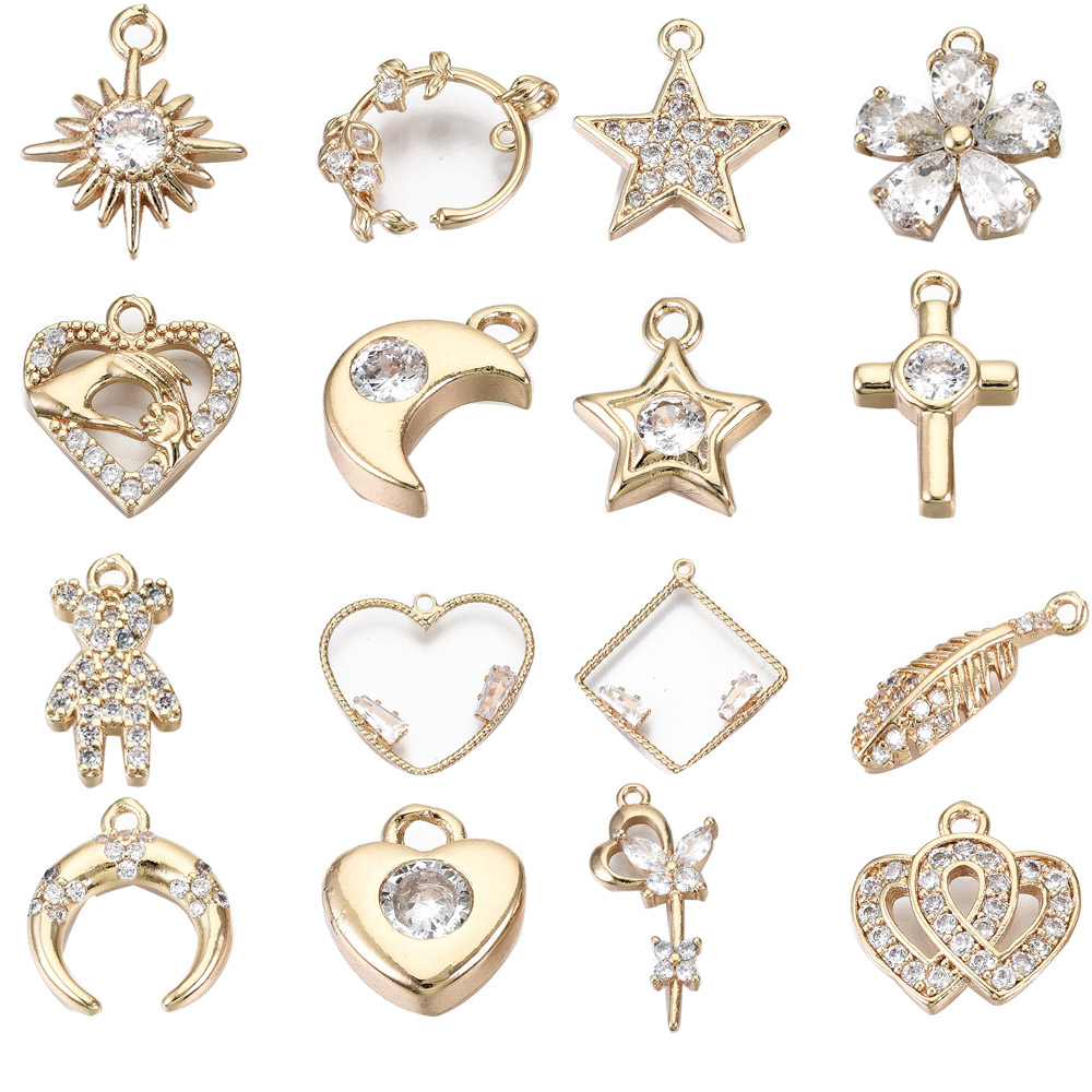 50pcs Brass Cubic Zirconia Dangle Charms Star Heart Flower Pendants 12.5x7.5mm