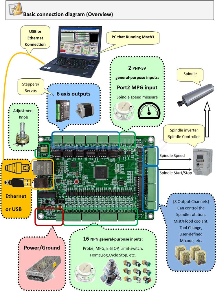 2 real-time electronic handwheel (MPG) input ports, can connect 2 electronic handwheels at the same time. When the MACH3 electronic handwheel is set in Multi-Step mode, it has the same real-time performance as the CNC machining center and runs smoothly. There is no delay in the control board, and the performance of the mechanical system is fully utilized.