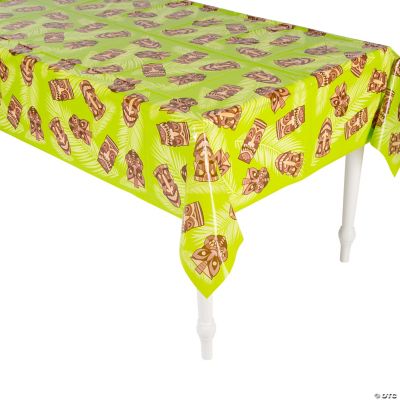 Extend your Tiki party decorations to the food table with this colorful plastic tablecloth featuring an assortment of Tiki faces. Great for a luau or Tiki-themed party, this disposable tablecloth will help protect the table from spills and make party cleanup a breeze! This tablecloth will help add to Tiki decorations in the party space. -Plastic.  Thin, slightly transparent.  Disposable.  54" x 108"