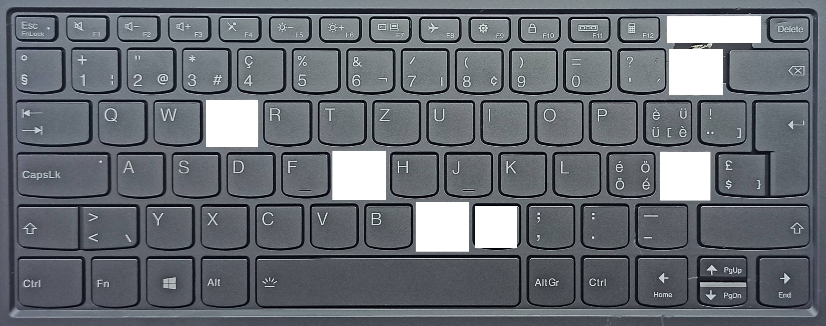 CHECK THE KEYBOARD LAYOUT AND AVAILABILITY OF KEYS - Keys that are currently unavailable are shown as white gaps in the pictures. If you have a keyboard with a regional layout (German, French, Spanish, etc.) and your key is not visible in the photo, please contact us. There’s a chance we have the key with the exact overprint you need.