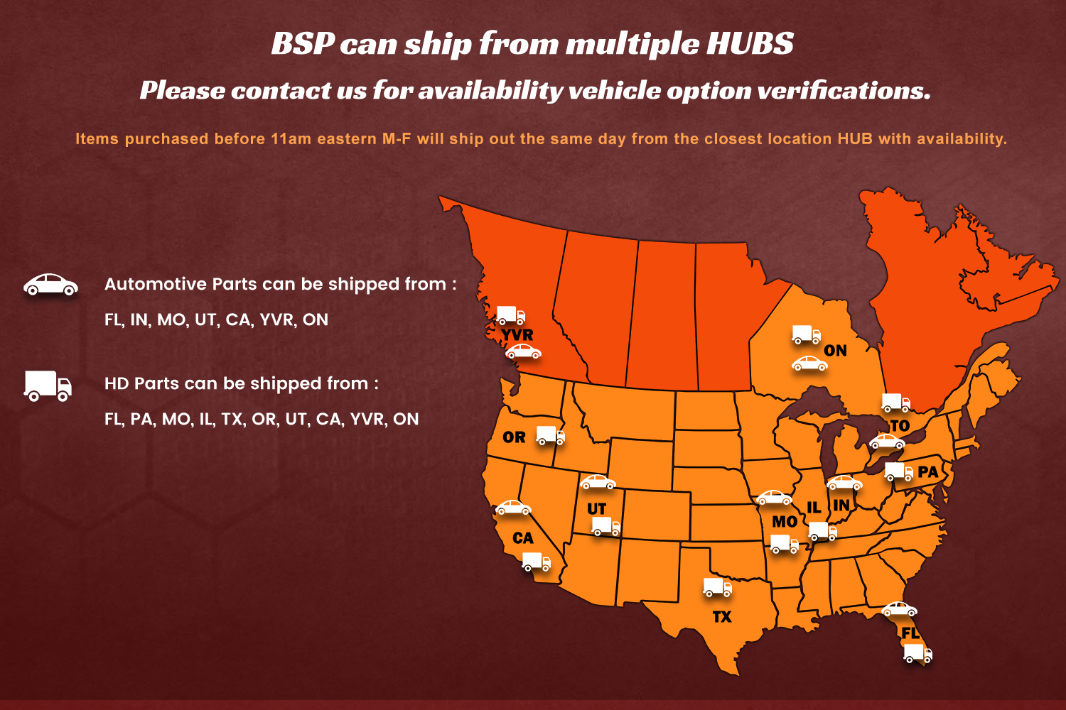 BSP is focused on providing our valued customers with full product coverage, original equipment quality, competitive pricing, and outstanding service. Our customers are serviced by a team of experienced sales professionals who pride themselves on providing a wide range of support and exceeding their customers expectations. Our customer service and warehouse teams are trained to efficiently process and ship all incoming orders from each of our distribution centers with 100% accuracy.