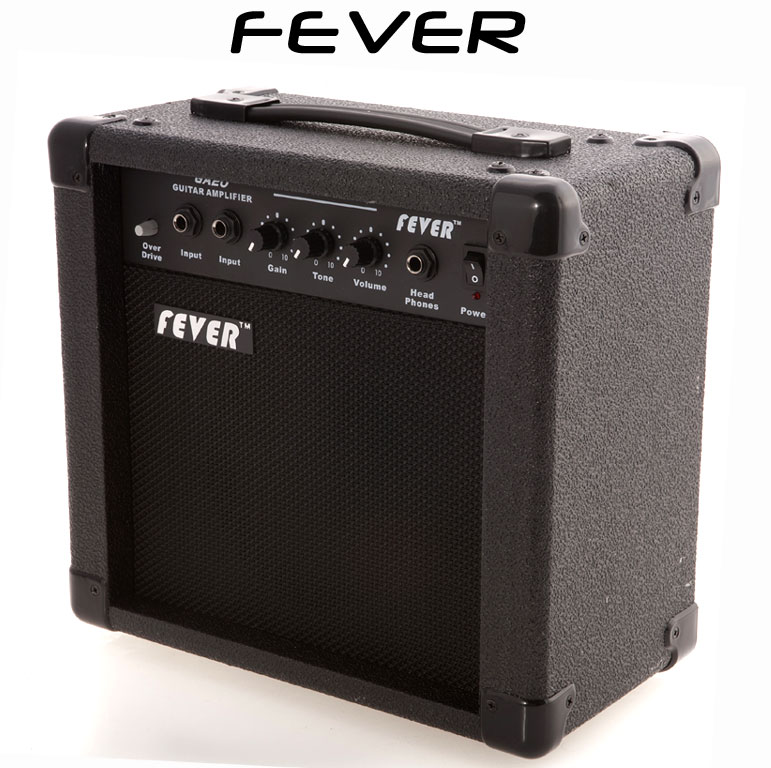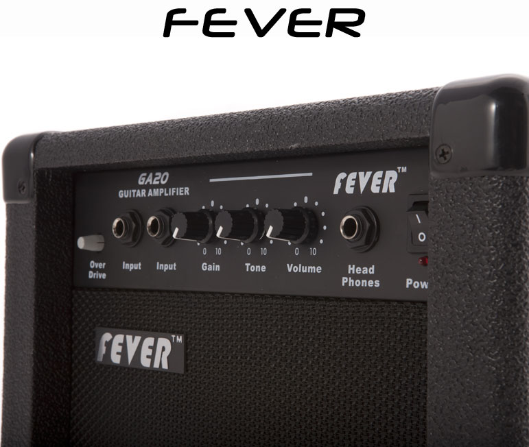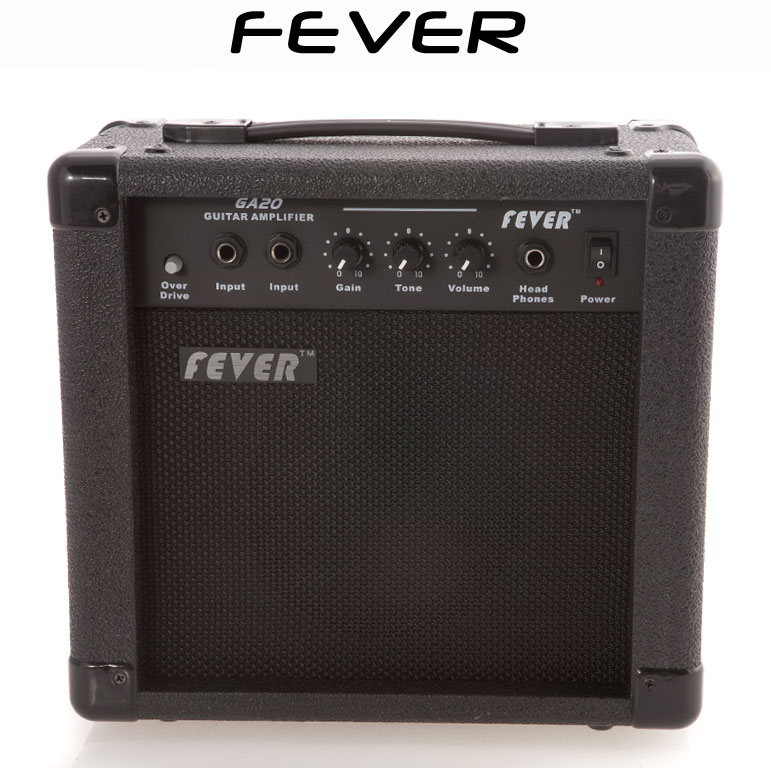Fever 20 Watt Guitar Amplifier! The Fever GA-20 Guitar amp has a great punch! The clean tones are sweet and the amp features an awesome overdrive effect! This Guitar Amp features 20 Watts power 2 inputs Gain Tone and Volume Controls. This amp has a headphone jack for quiet practice. Fever amps feature a scratch resistant covering durable handles and rubber bumper feet. A great practice Guitar amp at a great price! Pick one up today!