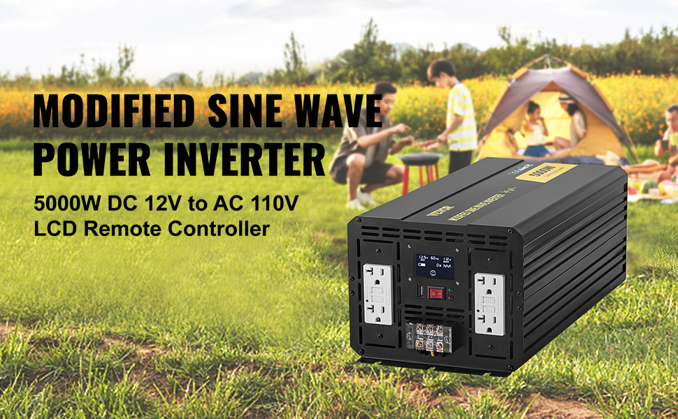 This modified sine wave inverter features an aluminum alloy shell, LCD screen, LED indicator, multiple protection measures, and LCD remote controller. Furthermore, it features a built-in temperature-controlled cooling fan, extending the battery's output and will not cause damage to the inverter or load. The low internal temperature can improve the efficiency of the inverter and extend the service life. Our power inverter transforms DC power into AC power, widely used for Emergency, Camping, Car, Home, RV, Solar. Therefore, it is a very wise decision to camping with our high-quality inverter that provides long-lasting current.
