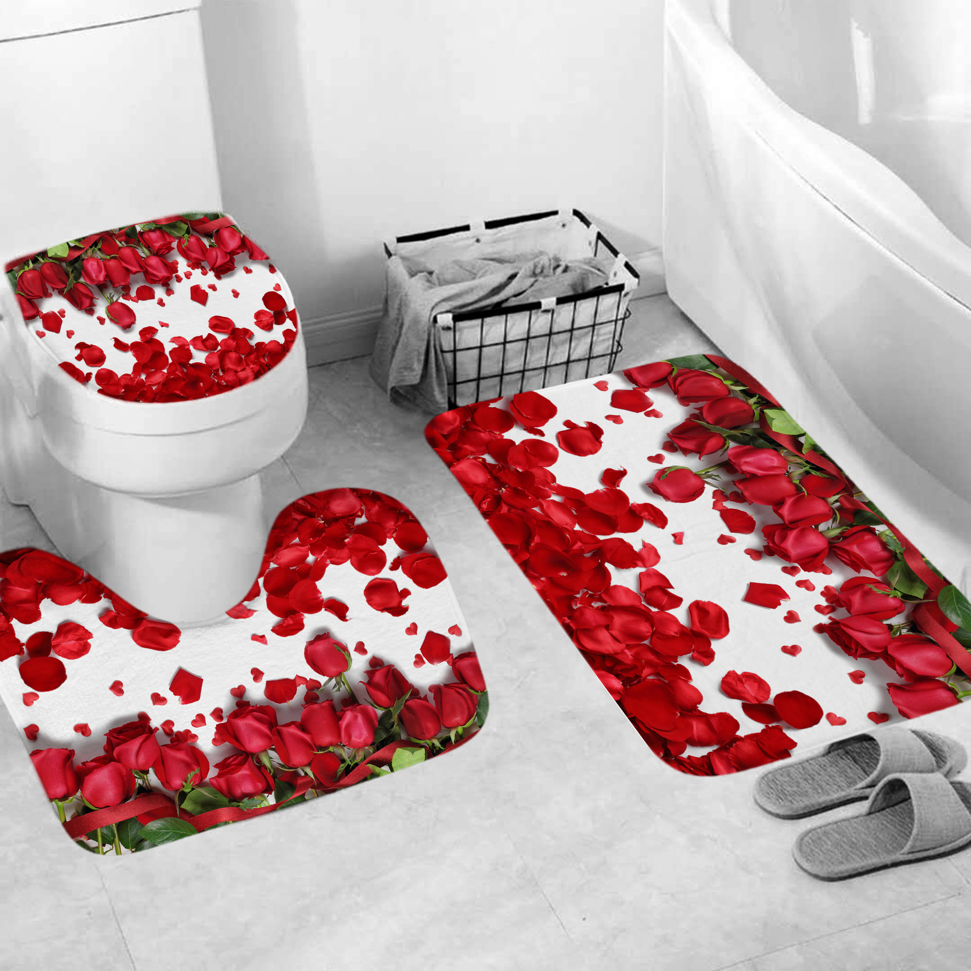 4pcs 1 x Shower curtain (With 12 hooks) 1x Pedestal Floor Rug 1 x Lid Toilet Cover 1 x Bath Mat