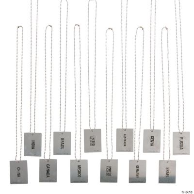 Teach kids about the flags of the world while also decking them out in dog tag style. Featuring Australia the United Kingdom USA Germany and more these necklaces are fun classroom giveaways during a multicultural or diversity studies lesson. Hand them out to students who exhibit A+ knowledge on a certain country. Outside of school these can be used as fun party favors at international events. 2 metal dog tags on 24 chains.