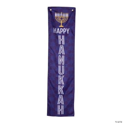 Decorate for the Festival of Lights with this attractive vertical bunting that is perfect for doors or walls. Featuring a durable, weather-resistant canvas material and an eye-catching design, this bunting is a great choice for a Hanukkah wall or door decoration. Display this bunting during Hanukkah or hang it up for a Hanukkah celebration. Woven canvas with metal grommets. 15" x 60"