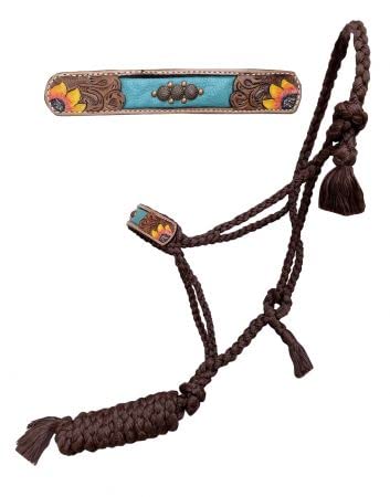 Showman Brown Nylon Mule Tape Halter w/ Sunflower & Teal Leather Noseband. This mule tape halter features brown woven nylon with a leather noseband. Noseband is accented with hand painted sunflowers, tooling and teal inlay with copper beads. Halter has tassel ends and removable 8' lead. Halter is lightweight and excellent for ground work or any other in-hand training. For an average full size horse.