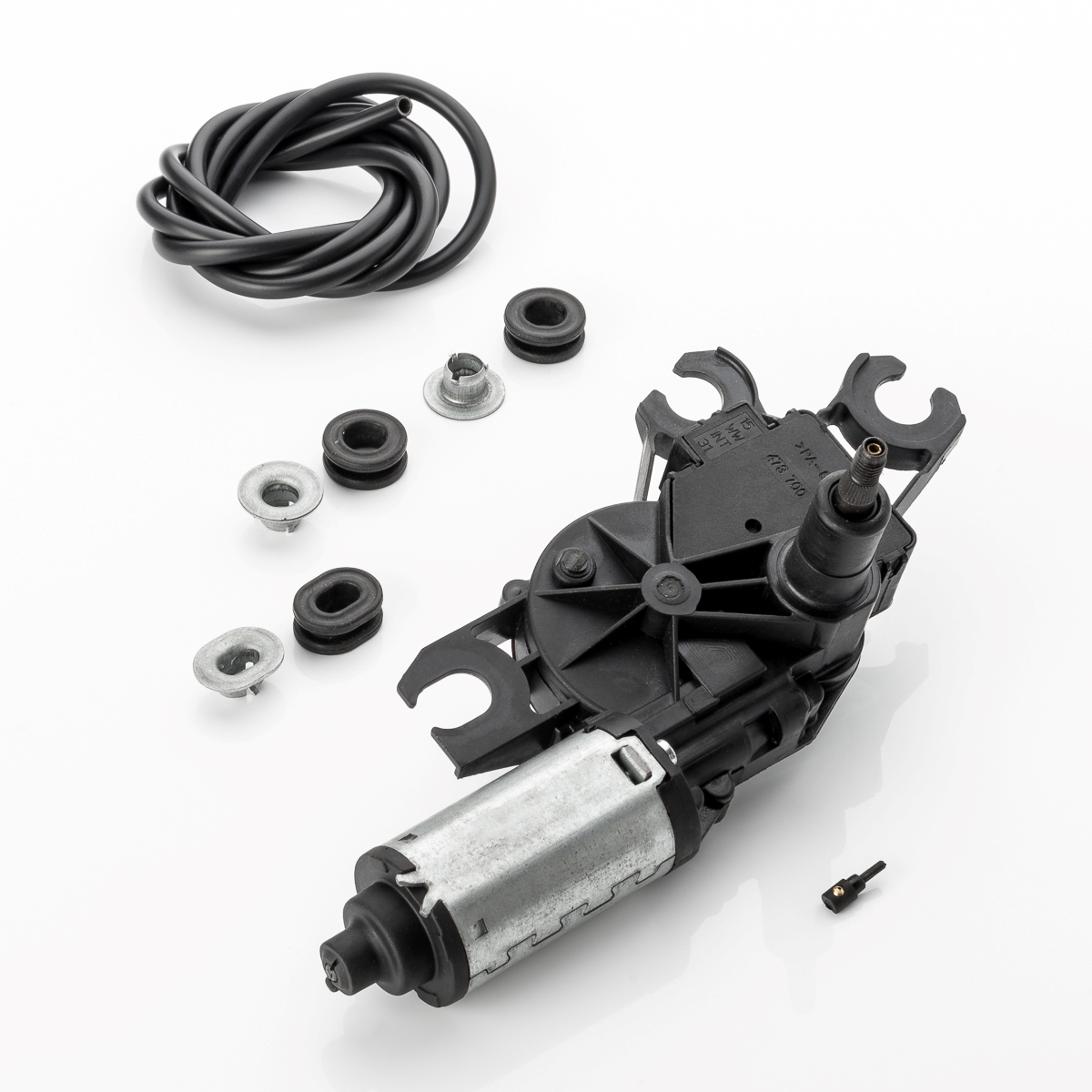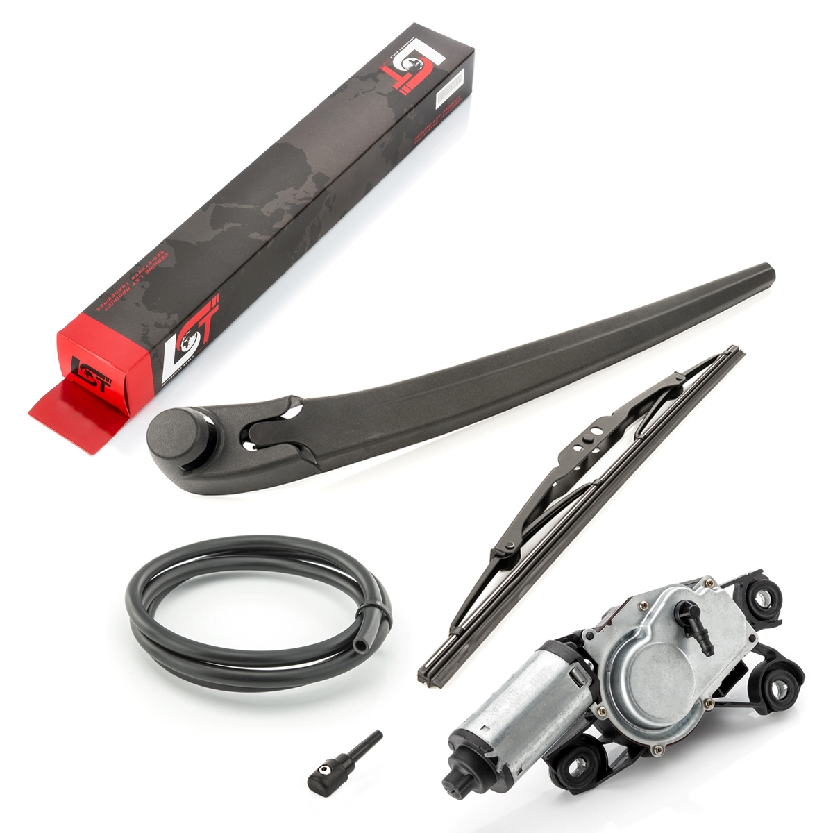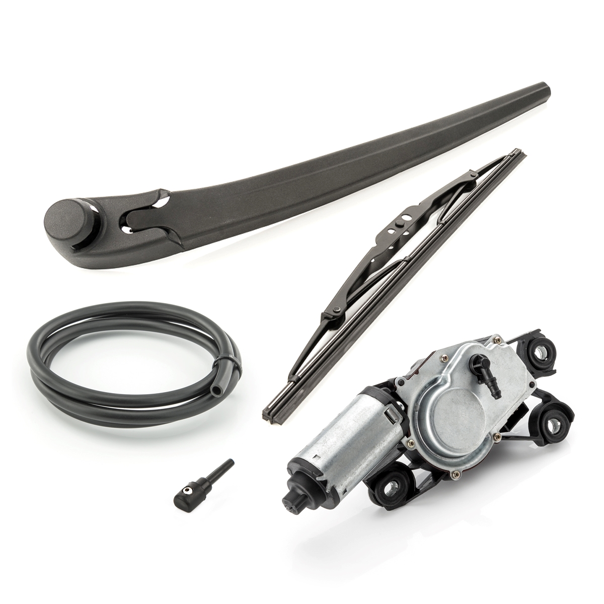 • 1x Wischermotor inkl. Wischerarm, Wischblatt, Abdeckkappe, Spritzdüse und 1m Schlauch