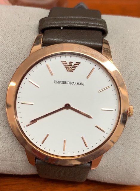 Watch Information: Gender: Men's Case Size: 43mm Dial Color: White Material Case: Gold Tone Stainless Steel Material Band: Leather Diamonds: n/a Movement: Analog Quartz Water Resist: 50 Meters Water Resistant Features: Analog Additional Info: Packaging: Emporio Armani Box and papers