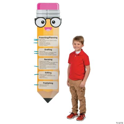 • CURRICULUM AIDS FOR EVERY GRADE LEVEL: Whether your students are in Pre-K or entering the 6th grade, you’ll find a variety of learning aids, activities and classroom décor that will supplement your curriculum.br • ENGAGE STUDENTS WITH ACTIVITES THAT BRING SUBJECTS TO LIFE: Dive into a world of learning with our selection of no-mess craft kits, STEM learning activities, color your own projects, SEL learning, active play and more.br • REINFORCE LEARNING WITH CLASSROOM THEMES: Don’t settle for drab, our classroom themes and decorations bring color and excitement to your learning space! Pick a theme for the year or change it up for each season or holiday.br • YOUR ONE-STOP-EDUCATION-SHOP: Oriental Trading is your primary destination for all things education and learning. You’ll find supplies, teaching aids and solutions and more for Pre-K through 6th grade at top-of-class prices.br br Product Description:br Use this Writing Process Chart to keep track of how close each student is to completing essays or short stories. Perfect for classroom teaching aids, this chart helps students visualize the flow of the writing process while teaching them what’s involved with each step along the way. Includes steps for prewriting/planning, drafting, revising, editing and publishing. The fun smiling pencil chart will have students looking forward to picking up their own writing utensil to start on their next draft! Includes 30 clothespins. Cardstock. (31 pcs. per unit) 17 1/2" x 64" © OTC