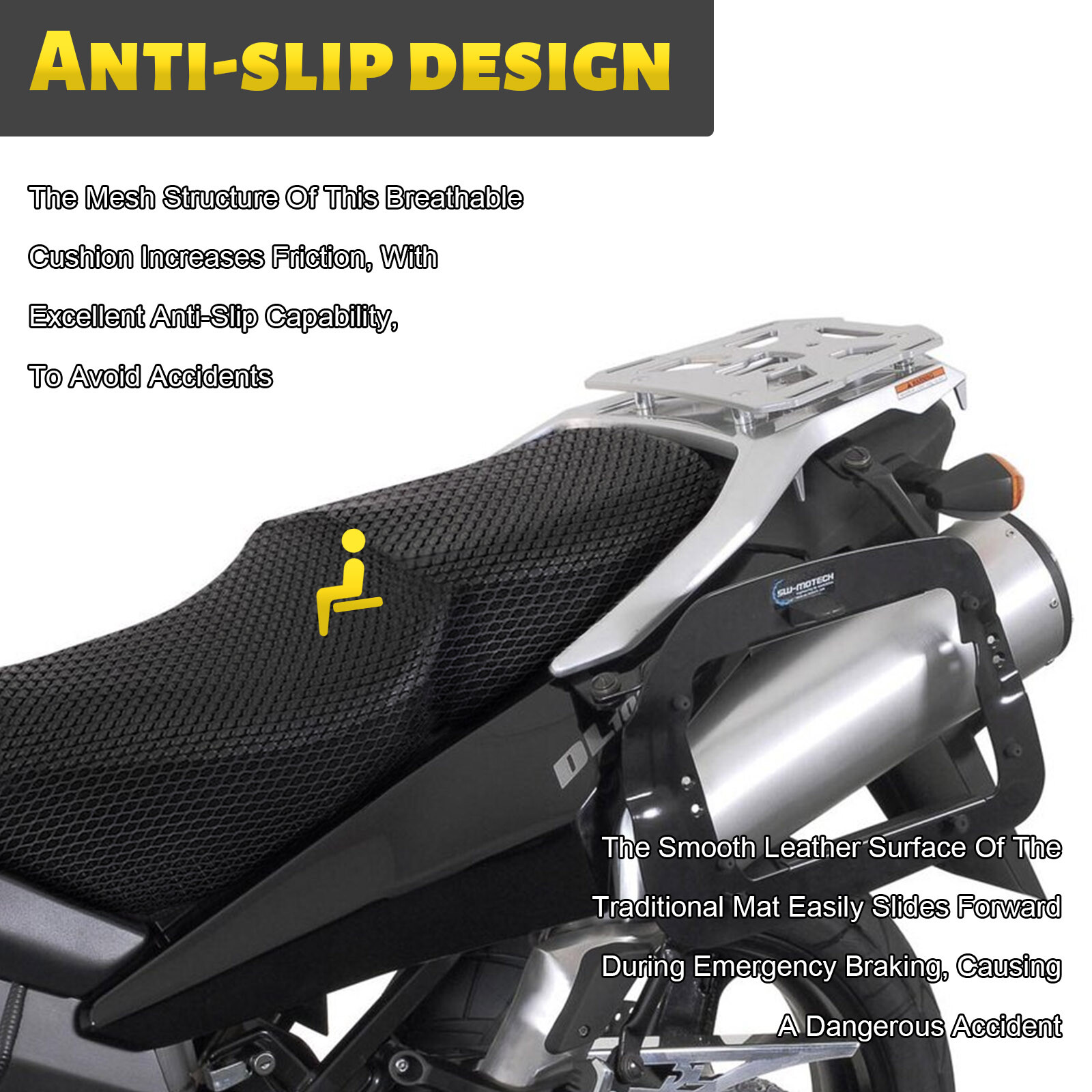 The Mesh Structure Of This Breathable Cushion Increases Friction, With Excellent Anti-Slip Capability, To Avoid Accidents.The Smooth Leather Surface Of The Traditional Mat Easily Slides Forward During Emergency Braking, Causing A Dangerous Accident.