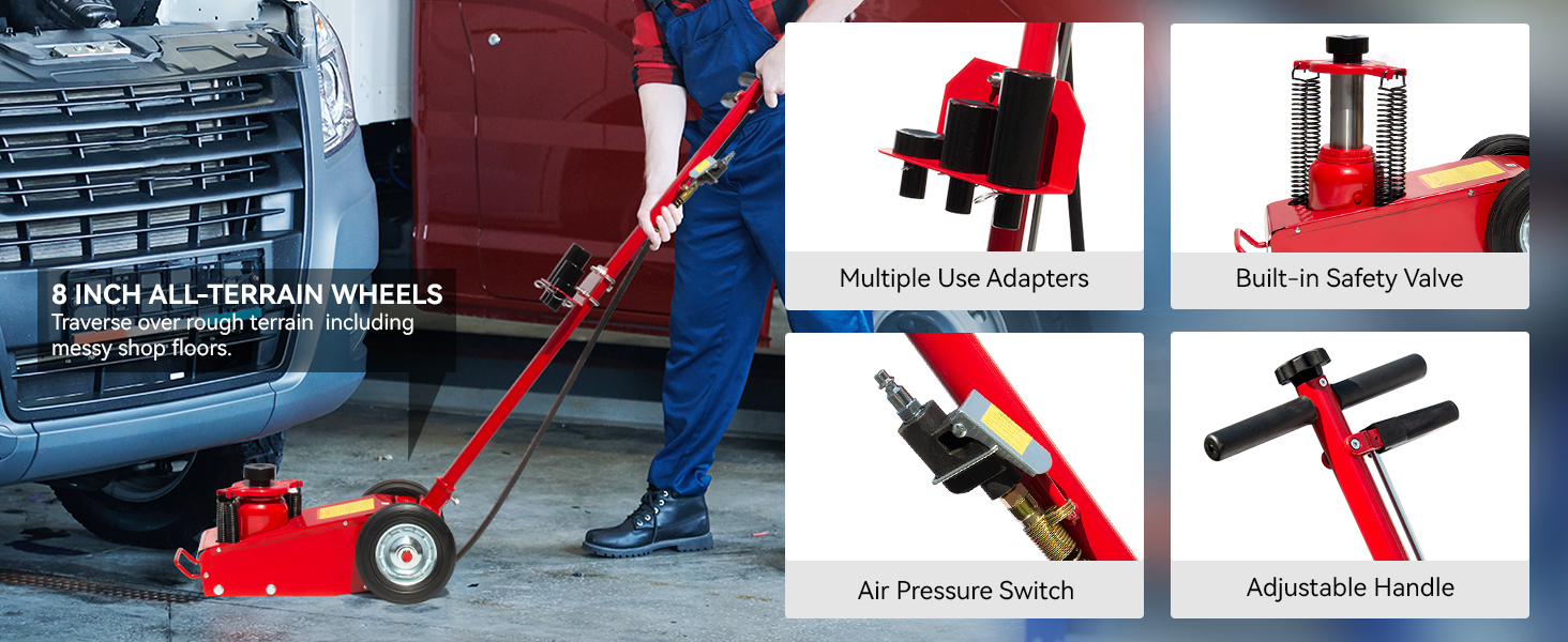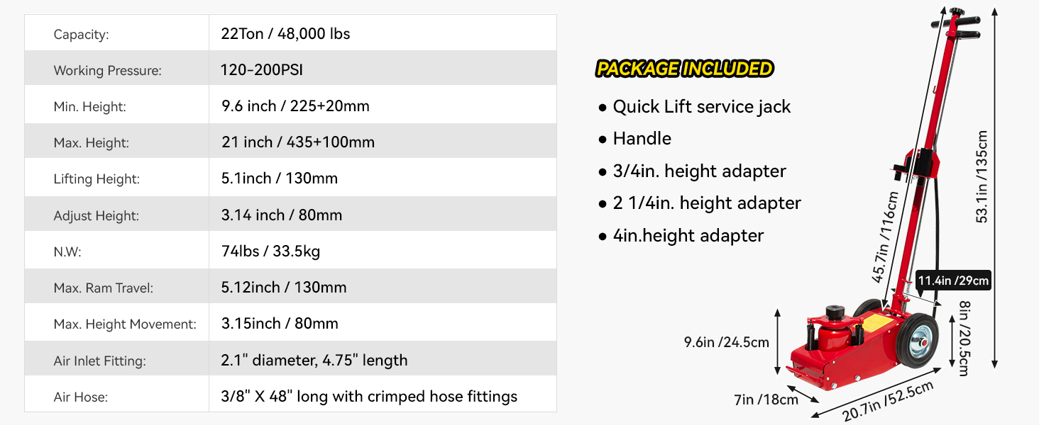 The 22-Ton Quick Lift Air/Hydraulic Service Floor Jack has a powerful air motor to lift heavy loads. A quick lift system allows the lifting ram to come in contact with the load faster. The compact design easily fits between dual tandem axles. Ideal for lifting axles, farm vehicles, heavy-duty machinery, industrial equipment, and more.