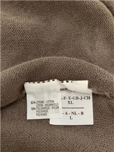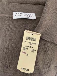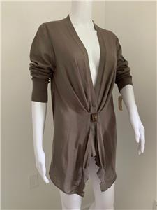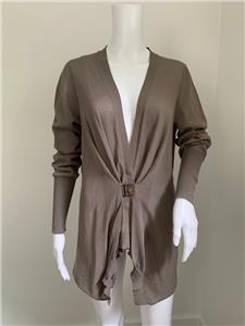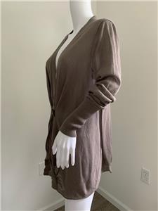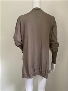 Relaxed and fashionable mushroom very fine all cotton cardigan sweater from Brunello Cucinelli is new with Bergdorf Goodman tag - deep V neckline with 3 hidden snaps for closure with added front tab also finished with snaps - interesting multi inverted pleats detail on neckline as well as below snap closure - love the color and style!.