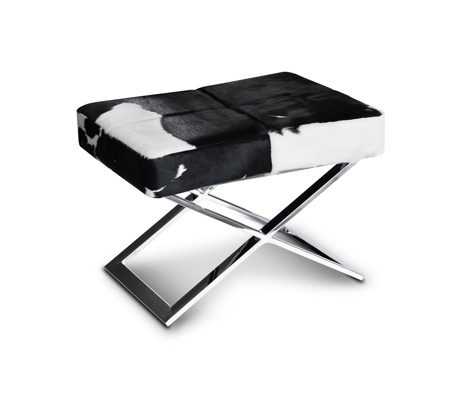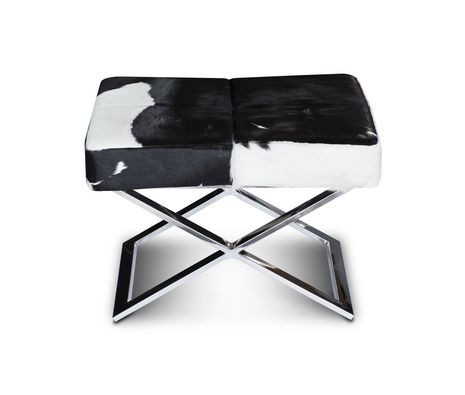 Schicker Kuhfell Leder Hocker mit X-förmigen Edelstahl Beinen. Echtes Kuhfell in Schwarz-Weiß.