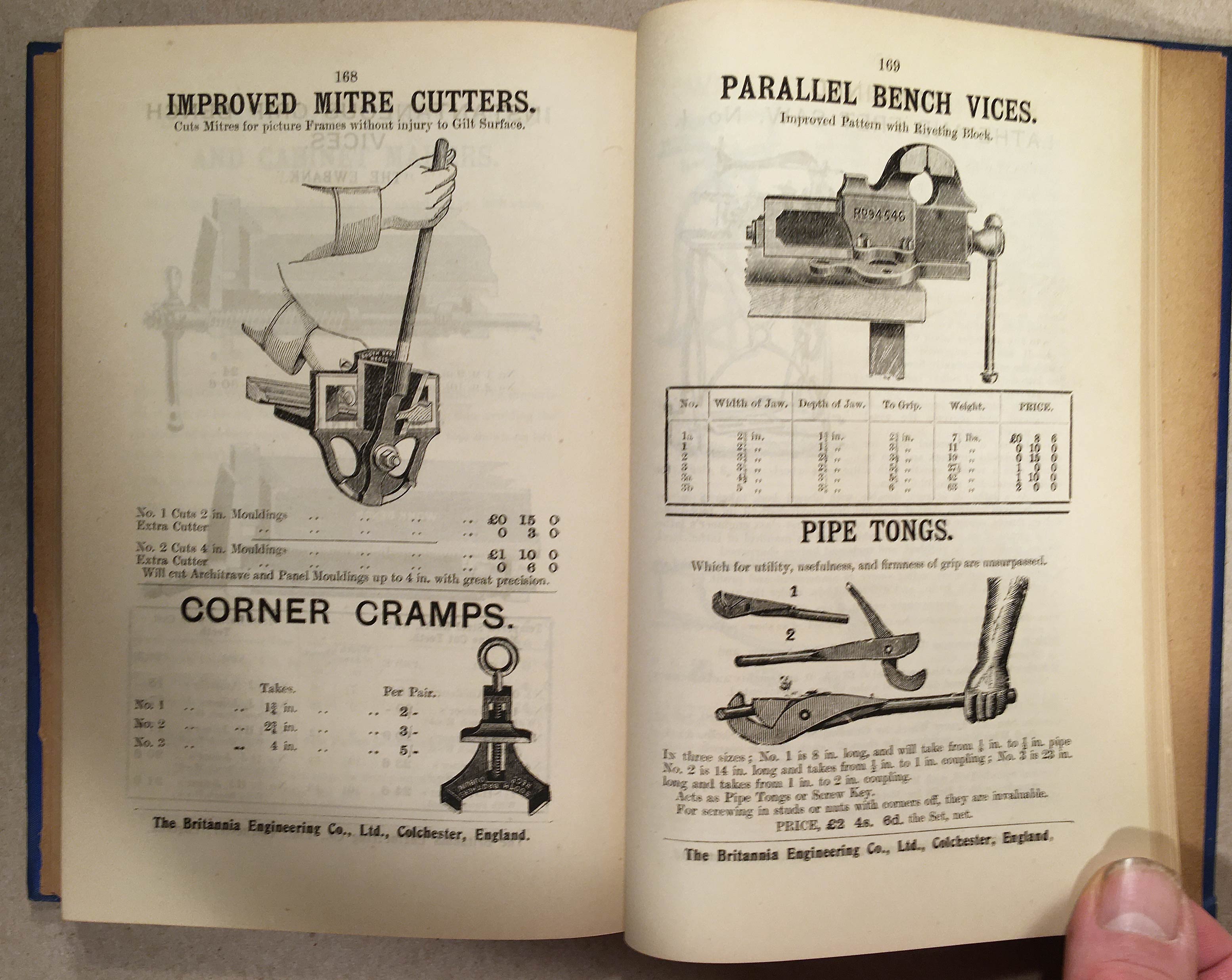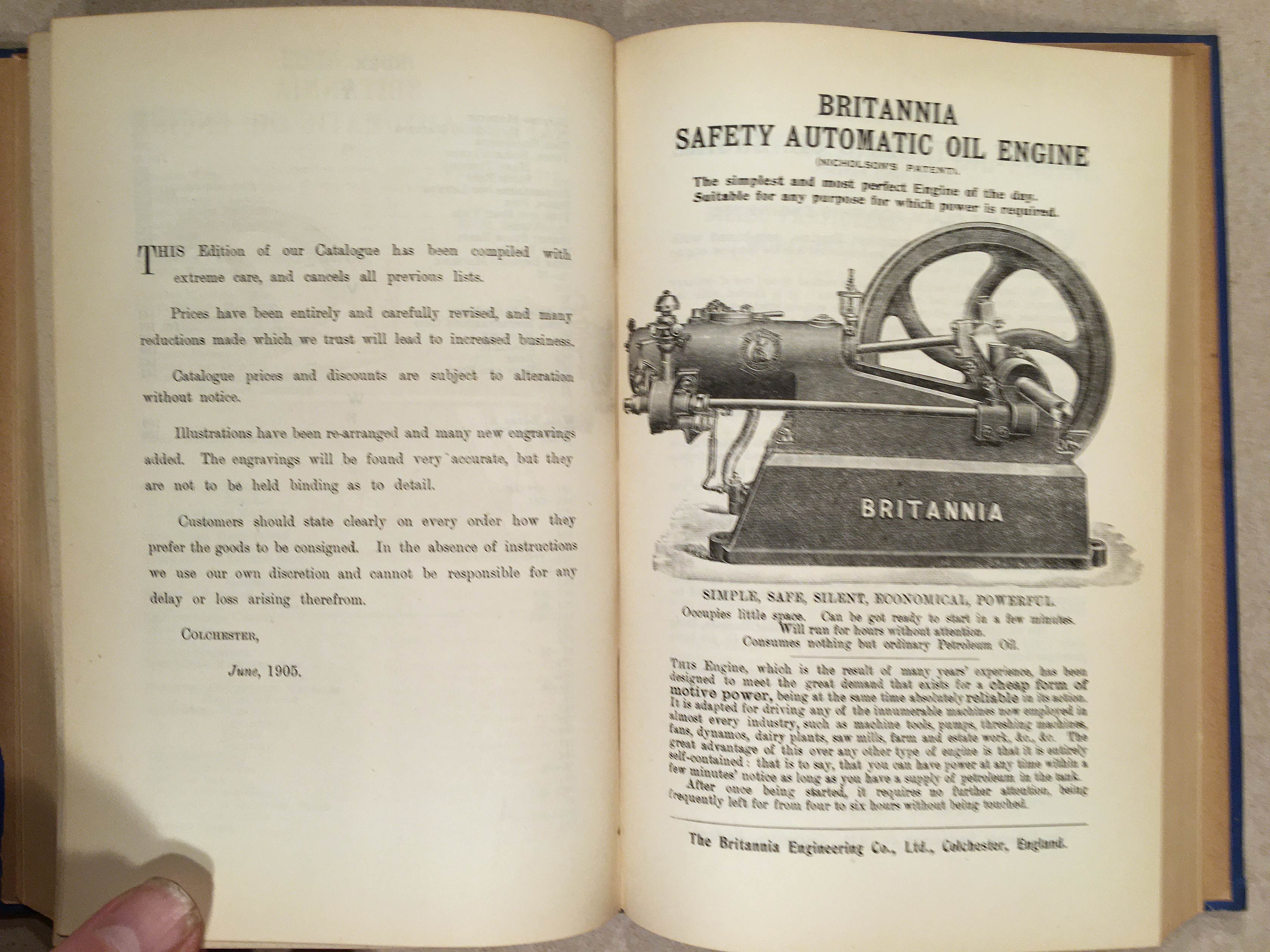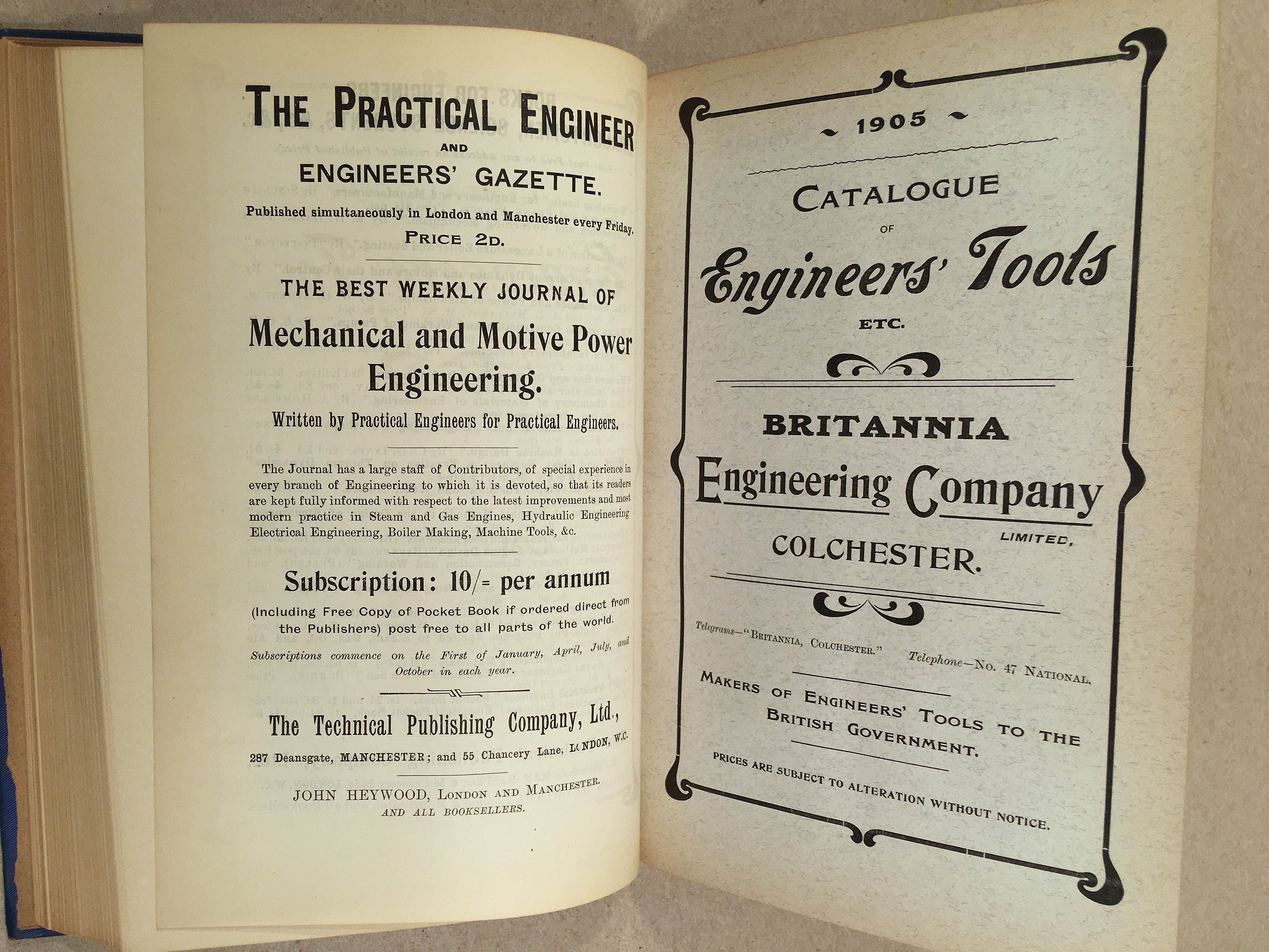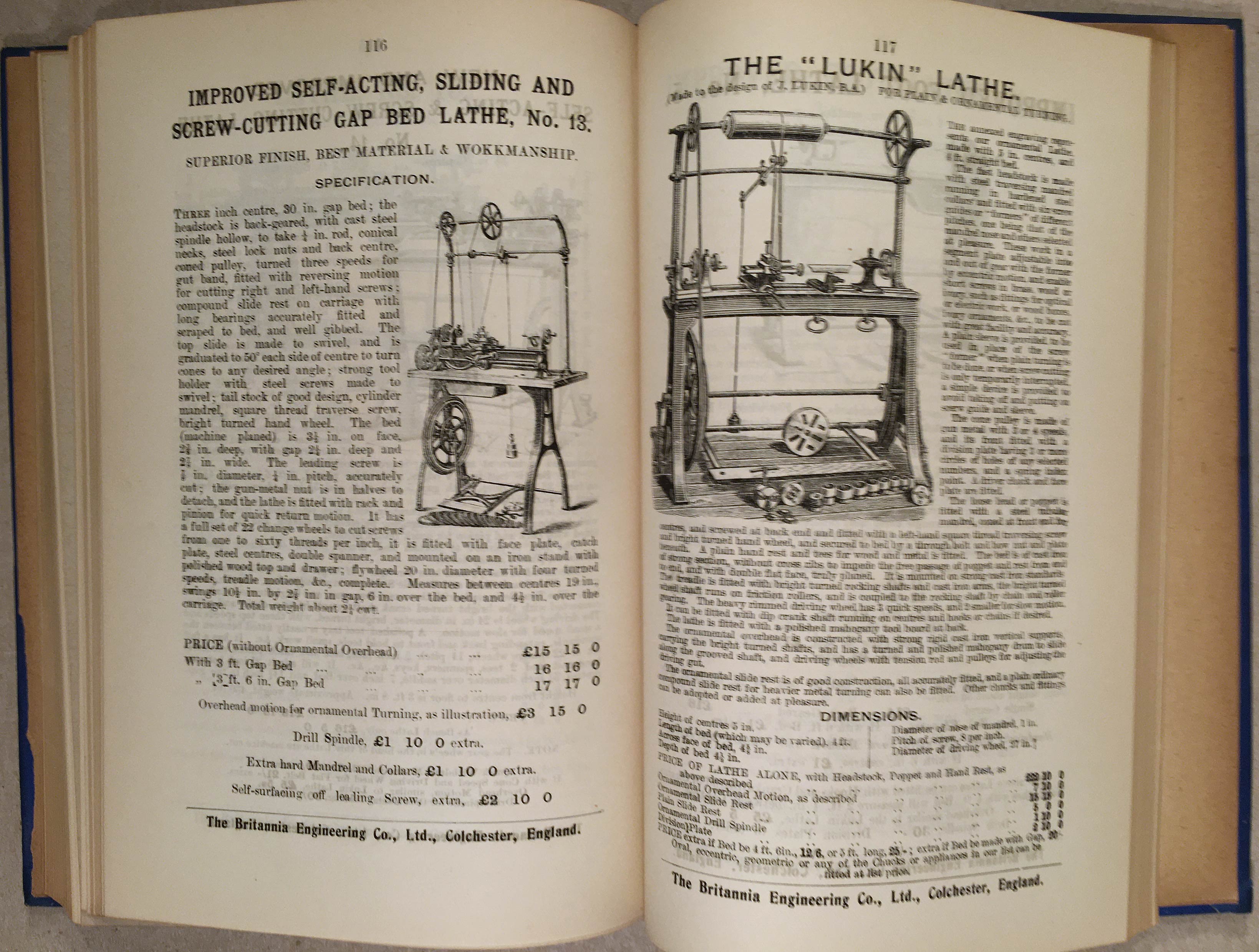In the second half of this volume, it is followed by the 1905 Catalogue of Engineers' Tools etc. from the Britannia Engineering Co. Ltd. of Colchester, which is 200 numbered pages, fully illustrated. It is assumed the company was a sponsor of the publication.