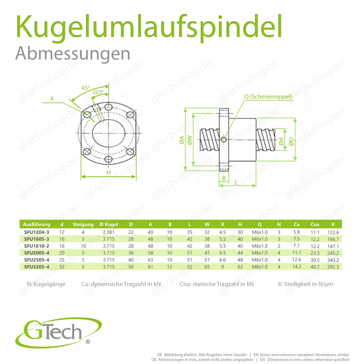 Standard SFU Ausfühungen Material und Mutterabmessungen
