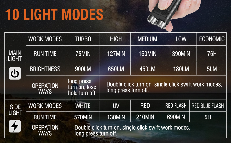 It usually have 3-5 Swith Modes including SOS, so it can use in Emergency Case;the Lighting Distance about 50-1000 m.