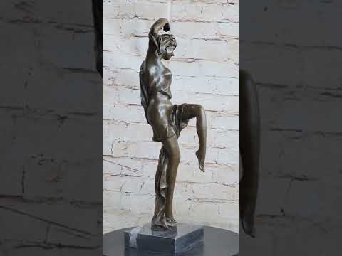 This captivating bronze statue brings to life the vibrant energy of a gypsy dancer, her lithe and graceful form captured in a moment of carefree movement. With arms and legs lifted in a fluid and expressive manner, she exudes an air of joyful abandon, inviting viewers to join in her spirited dance. The striking green tint of the bronze, complemented by the green marble base, adds an intriguing dimension to the sculpture, drawing the eye and sparking curiosity.