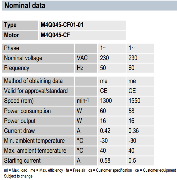 | R007029 | M4Q045-CF01-01 | 16 W | 60 W | 0.42 | 1.3 kg | 1300r/min | 240V |