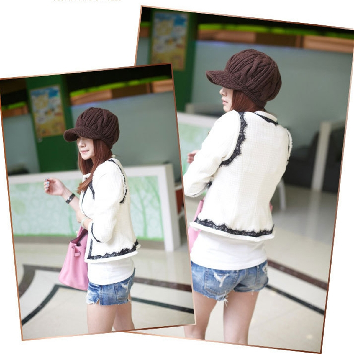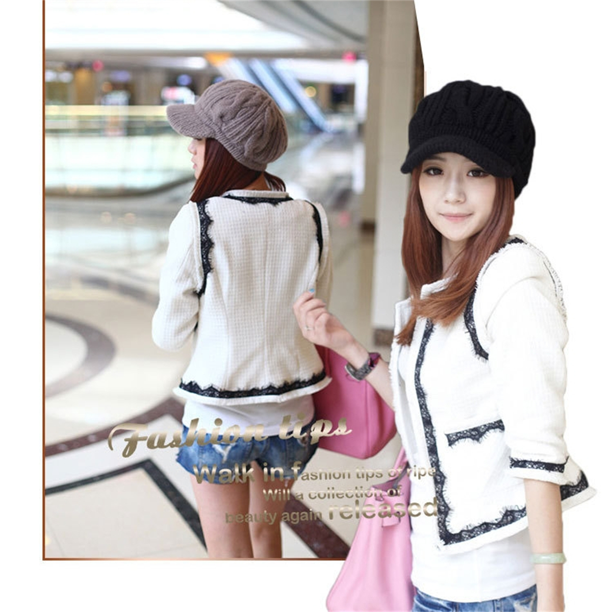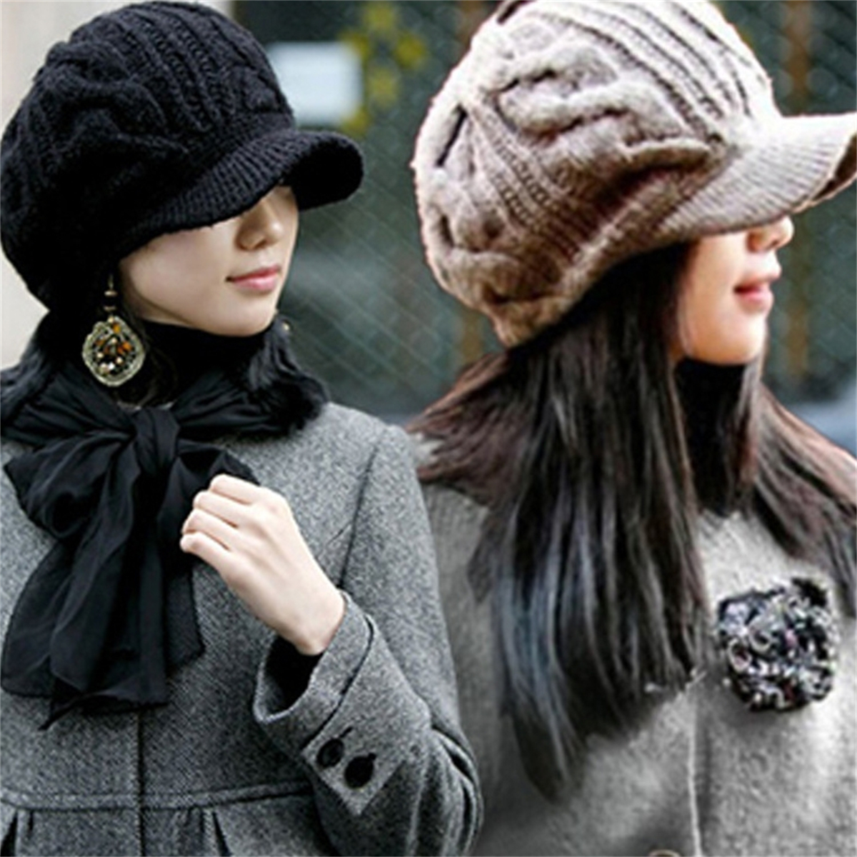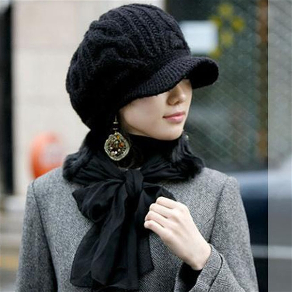 Women Winter Warm Knitted Hats Slouchy Wool Beanie Hat Cabbie Cap With Visor