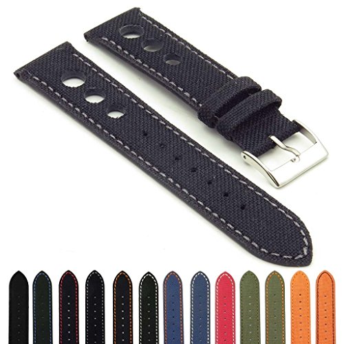 DASSARI's Turbo strap is constructed from nylon with genuine leather backing. This stylish rally strap has contrast stitching with matching color rally holes.