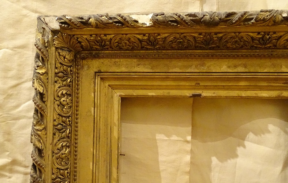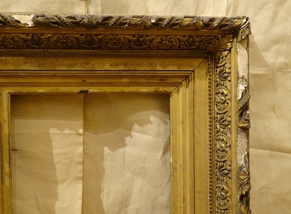 Grand cadre style Barbizon en bois stuqué doré à décor de frises de volutes feuillagées et feuilles d'acanthe, d'époque XIXème siècle.