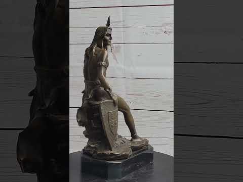 The sculpture captures not only the physicality of the warrior but also the grace inherent in his demeanor. His flowing hair cascades to his shoulders, framing a strong facial structure that reflects both determination and ancestral wisdom. Positioned on a solid black marble base, the sculpture gains a grounded presence, elevating the depiction of the Native American warrior to a timeless representation of strength, courage, and cultural heritage.
