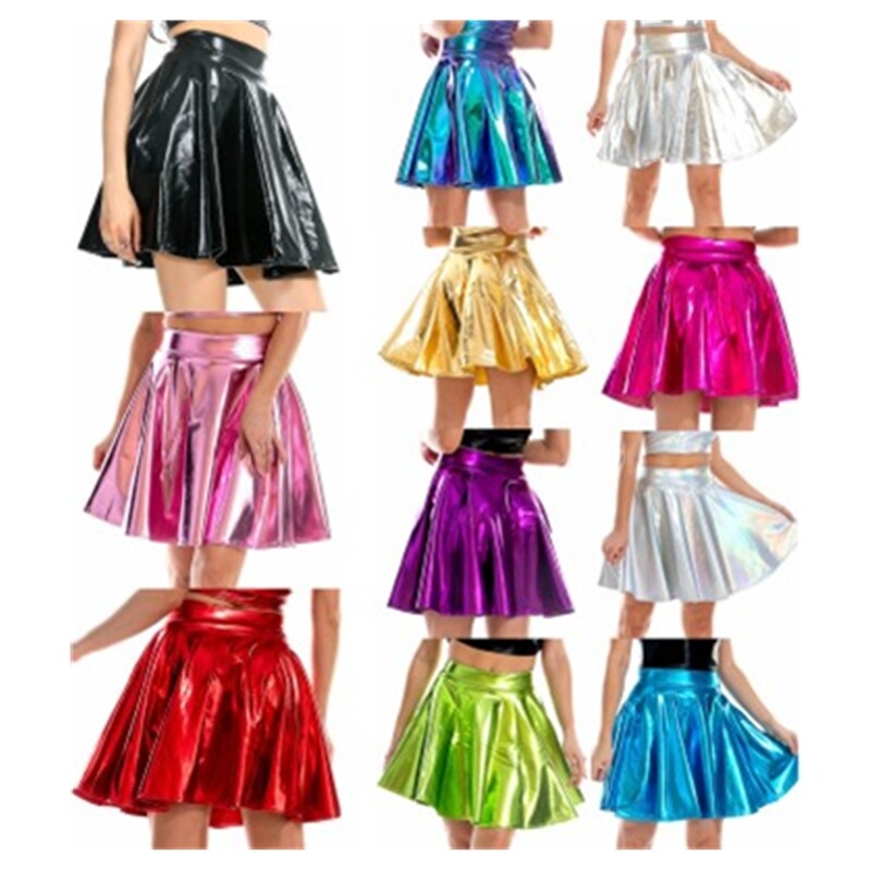 Women Glossy High Waist Flare Skirt Club Stage Costume Party Dancewear Shiny Metallic Ruffle Skirts.
