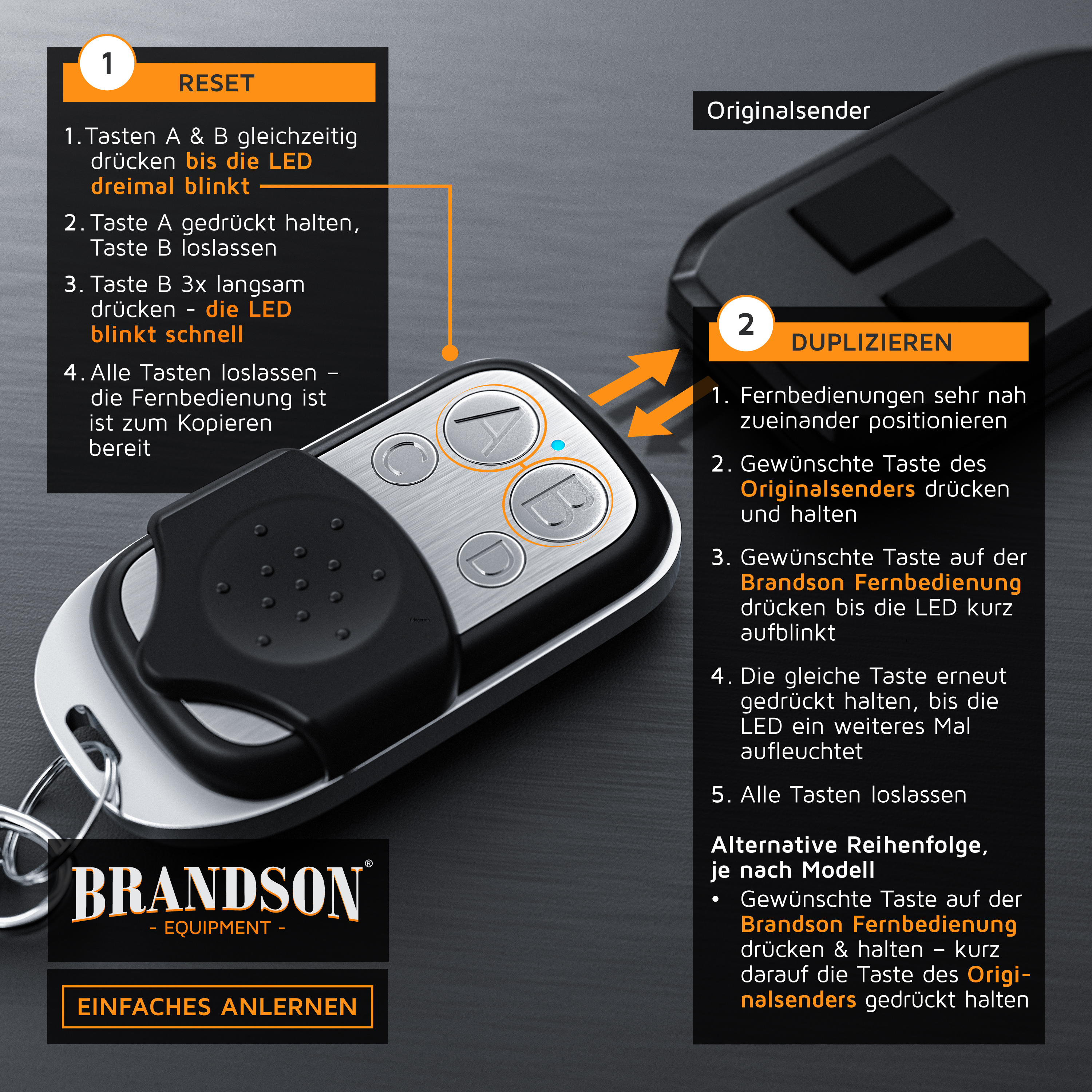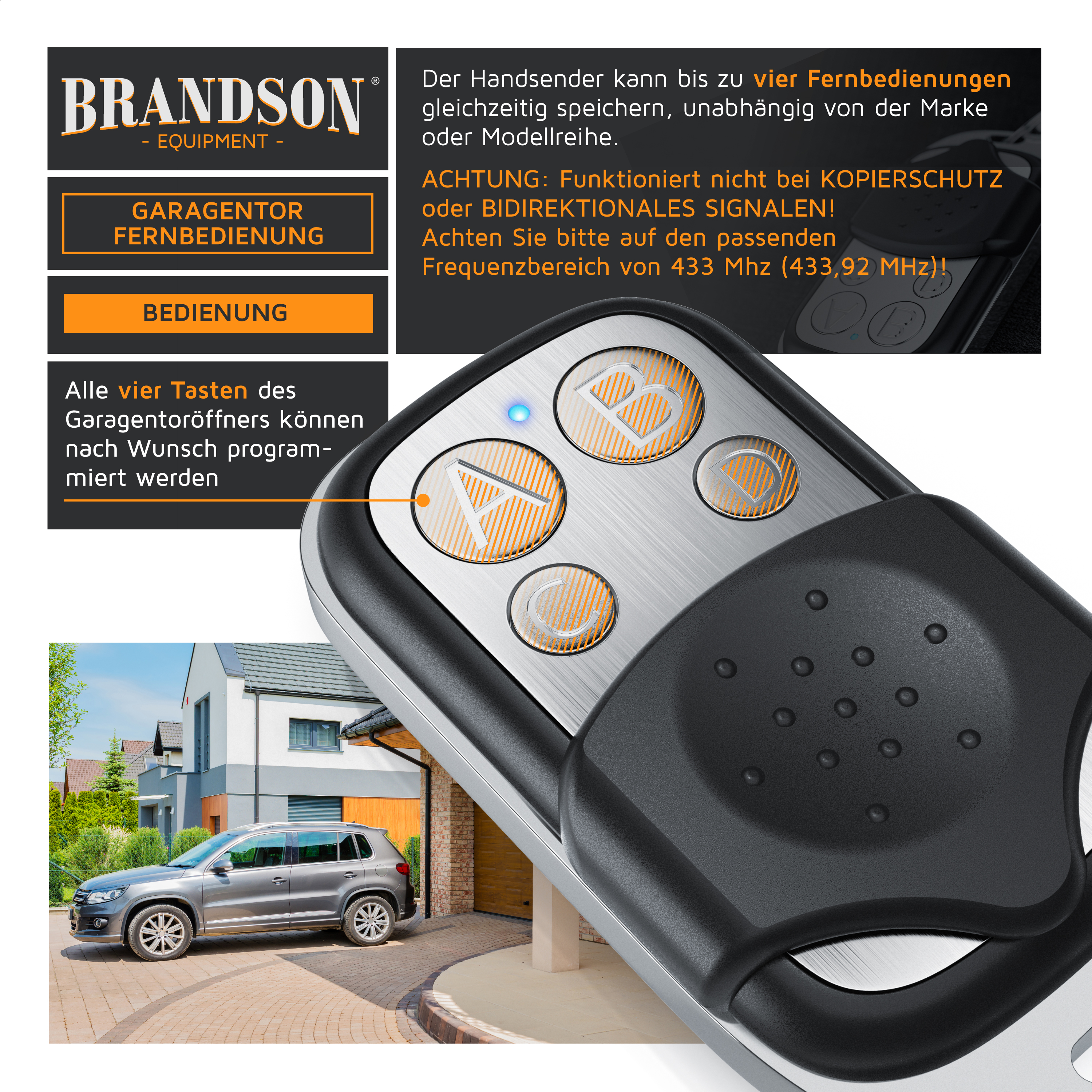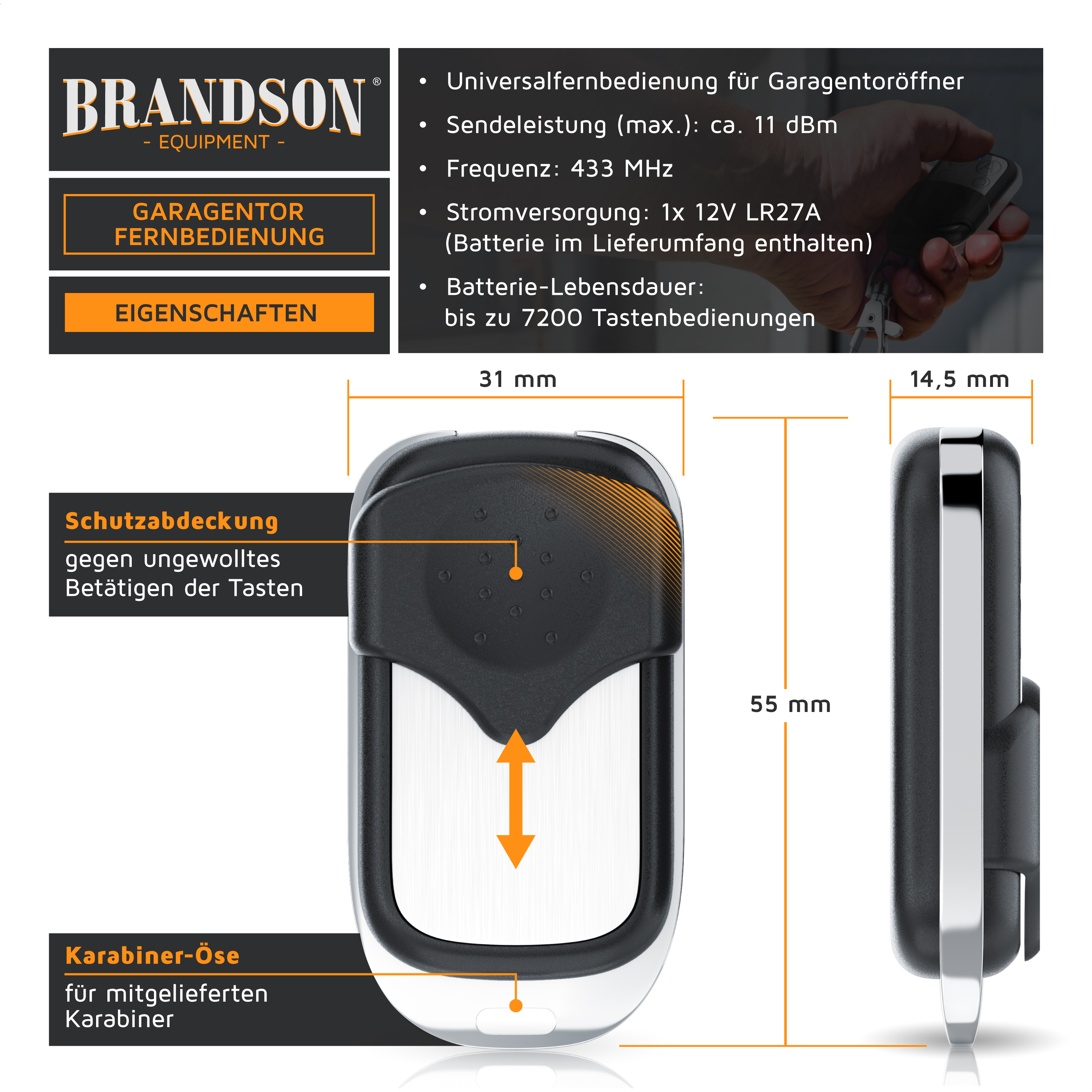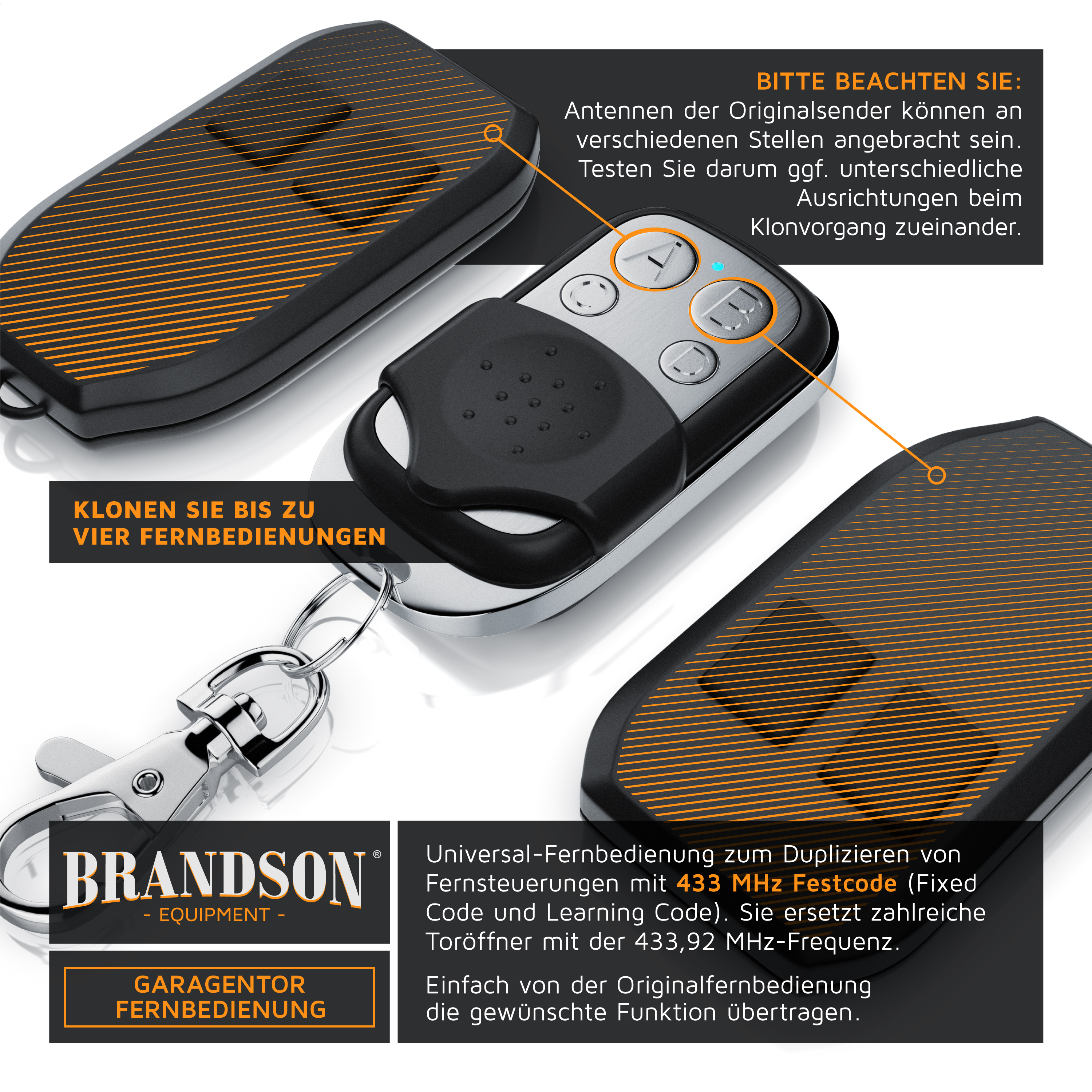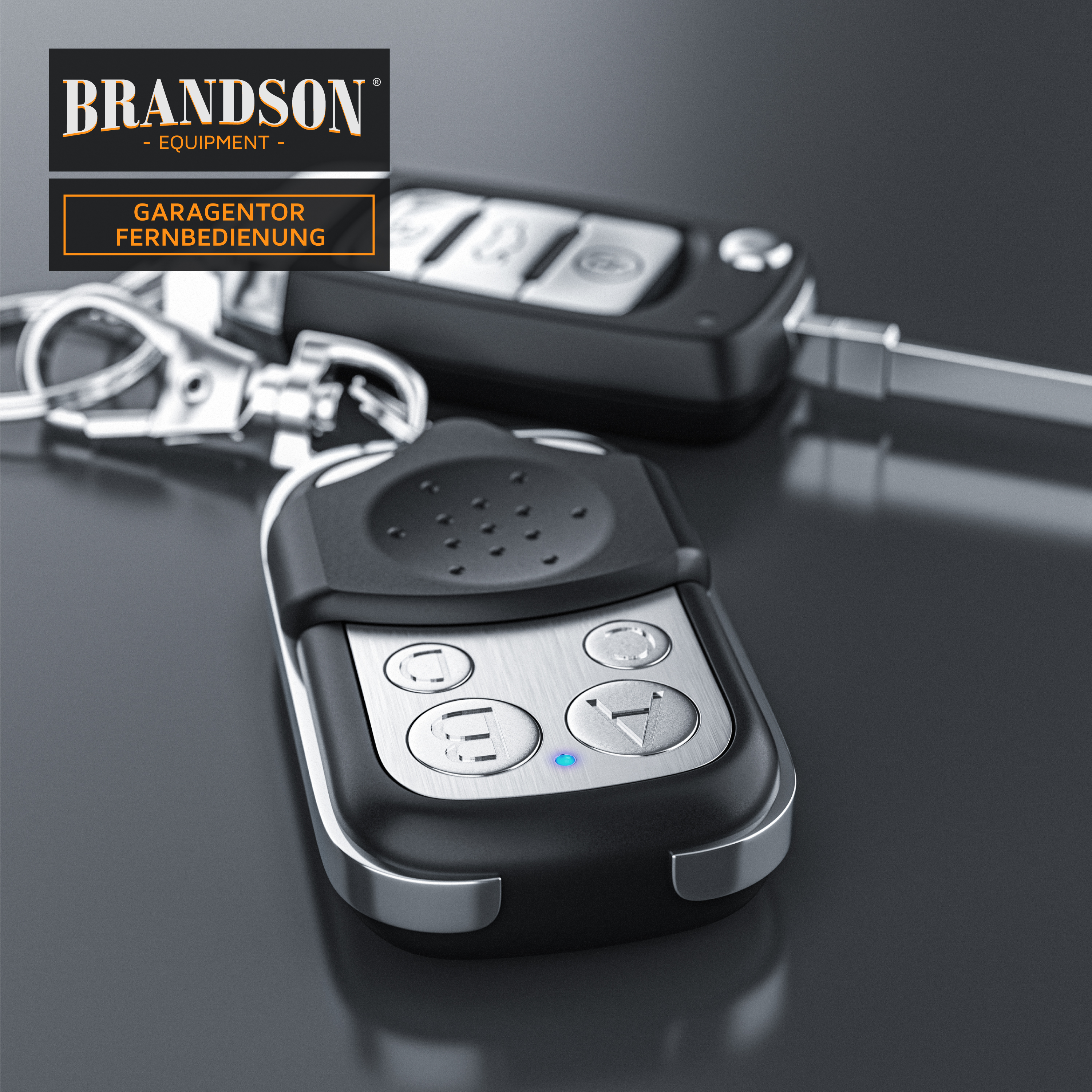 Die Brandson Universalfernbedienung für Garagentoröffner mit 433,92 MHz. Ideal als Ersatz und Zweitsteuerung.UNIVERSAL-FERNBEDIENUNG zum Duplizieren von Fernsteuerungen mit 433 MHz Festcode (Fixed Code und Learning Code). Sie ersetzt zahlreiche Toröffner mit der 433,92 MHz-Frequenz. Reichweite: bis zu 80 m im Freien und bis zu 15 m aus dem Auto. Inklusive 12V Batterie, ermöglicht ca. 7200 x Tastenbedienungen.