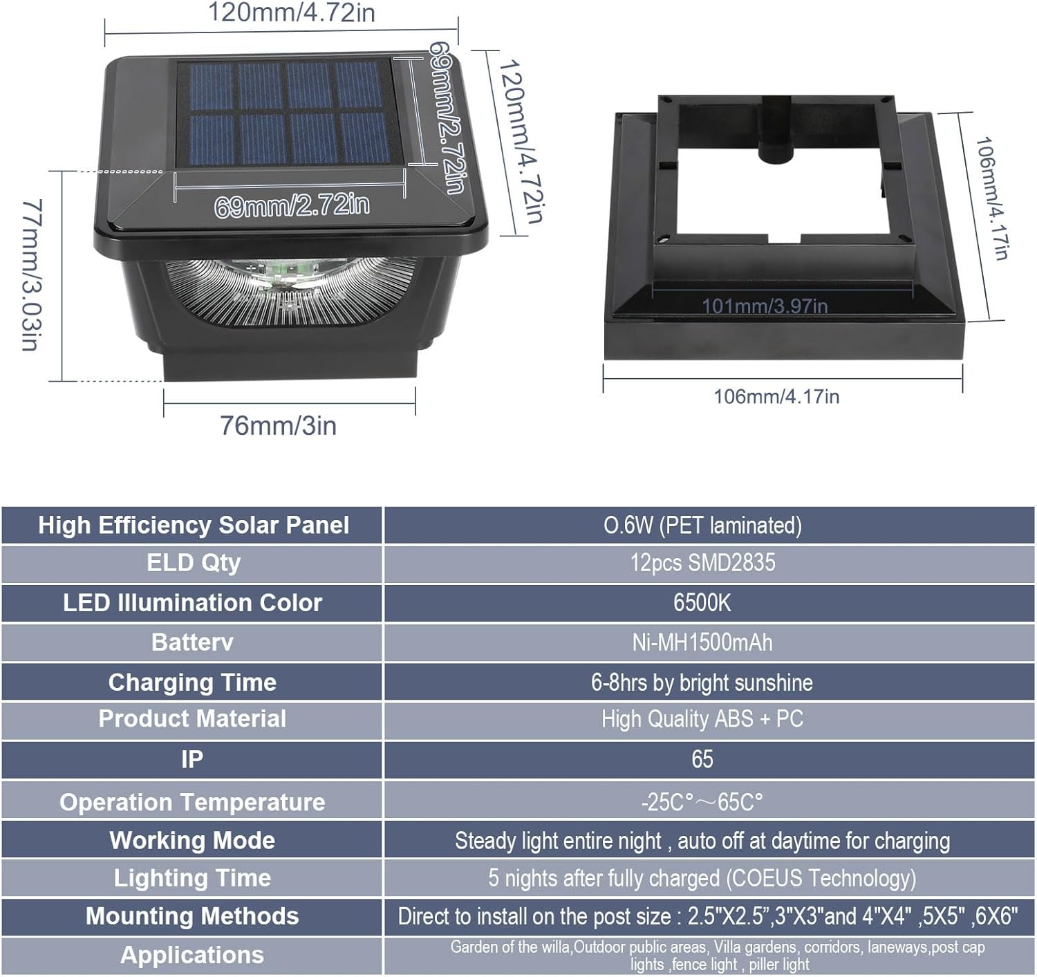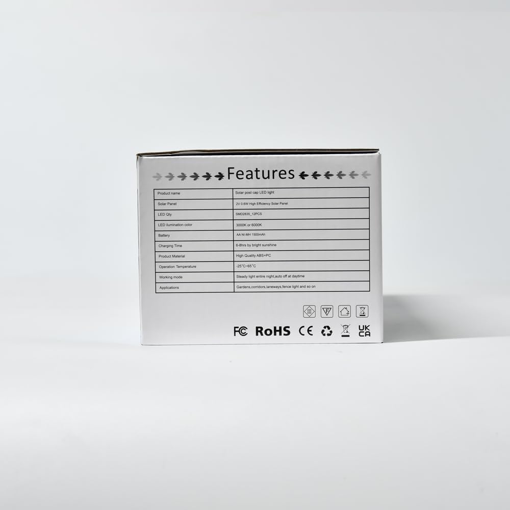 【Modern Looking Post Top Lights】: Built-in 12 LED 6500K outdoor post lights, made of hight quality ABS+PC,battery with long life service,steady light for all night.Pure White light creates a elegant and peace atmosphere,provide convenience for a night walk. Size: 4.72 x 4.72 x H2.98 inch per light.