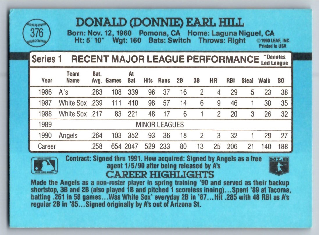 | Description: | Donnie Hill | | Category: | Baseball | | Year: | 1991 | | Product: | Donruss | | Team: | California Angels | | Card Number: | 376 | | Dimensions: | 3¼" x 2½" |