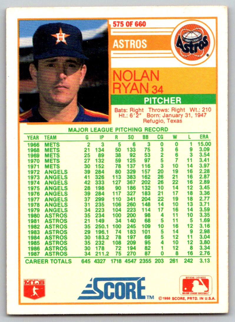 | Description: | Nolan Ryan | | Category: | Baseball | | Year: | 1988 | | Product: | Score | | Team: | Houston Astros | | Card Number: | 575 | | Dimensions: | 3¼" x 2¼" |