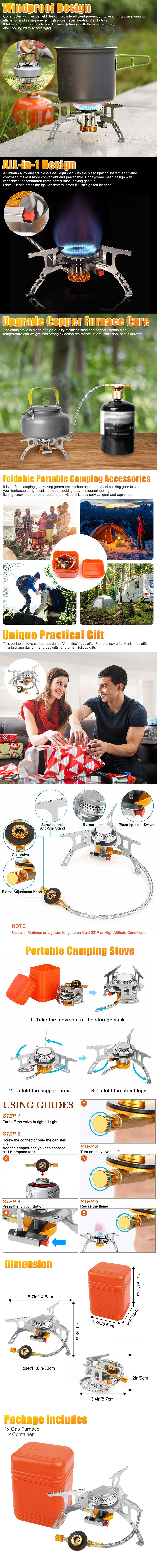 ALL-in-1 Design: Aluminum alloy and stainless steel, equipped with the piezo ignition system and flame controller, make it more convenient and practicable. Honeycomb mesh design, concentrated flame combustion, saving gas fuel. (Note: Please press the ignition several times if it isn't ignited by once! )