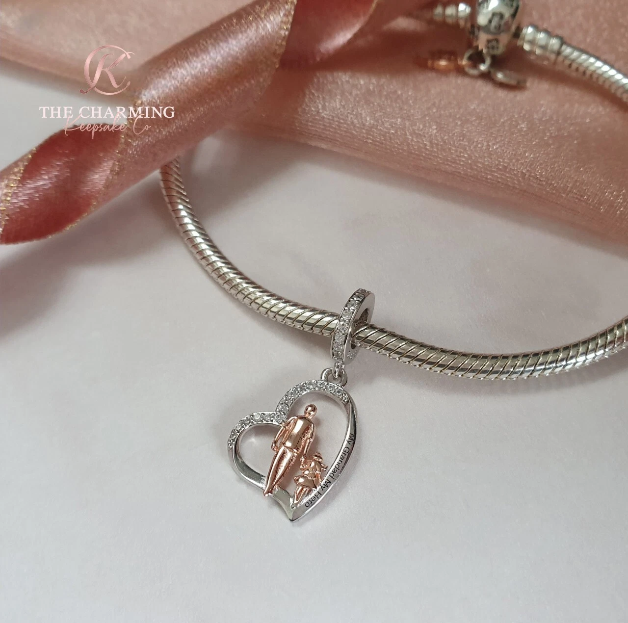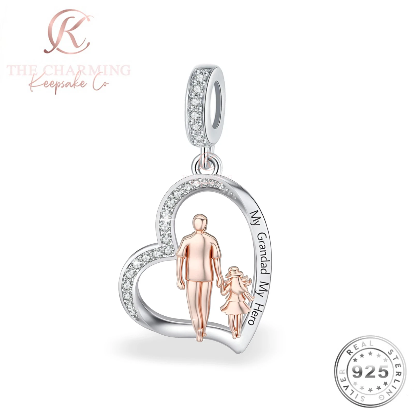 Beautiful and high quality 925 sterling silver charm featuring a heart shaped pendant decorated with sparkling clear cubic zirconia crystals. Within the heart is a rose gold Grandfather figurine holding hands with his Granddaughter. The charm is inscribed with small delicate text reading 'My Grandad My Hero'.