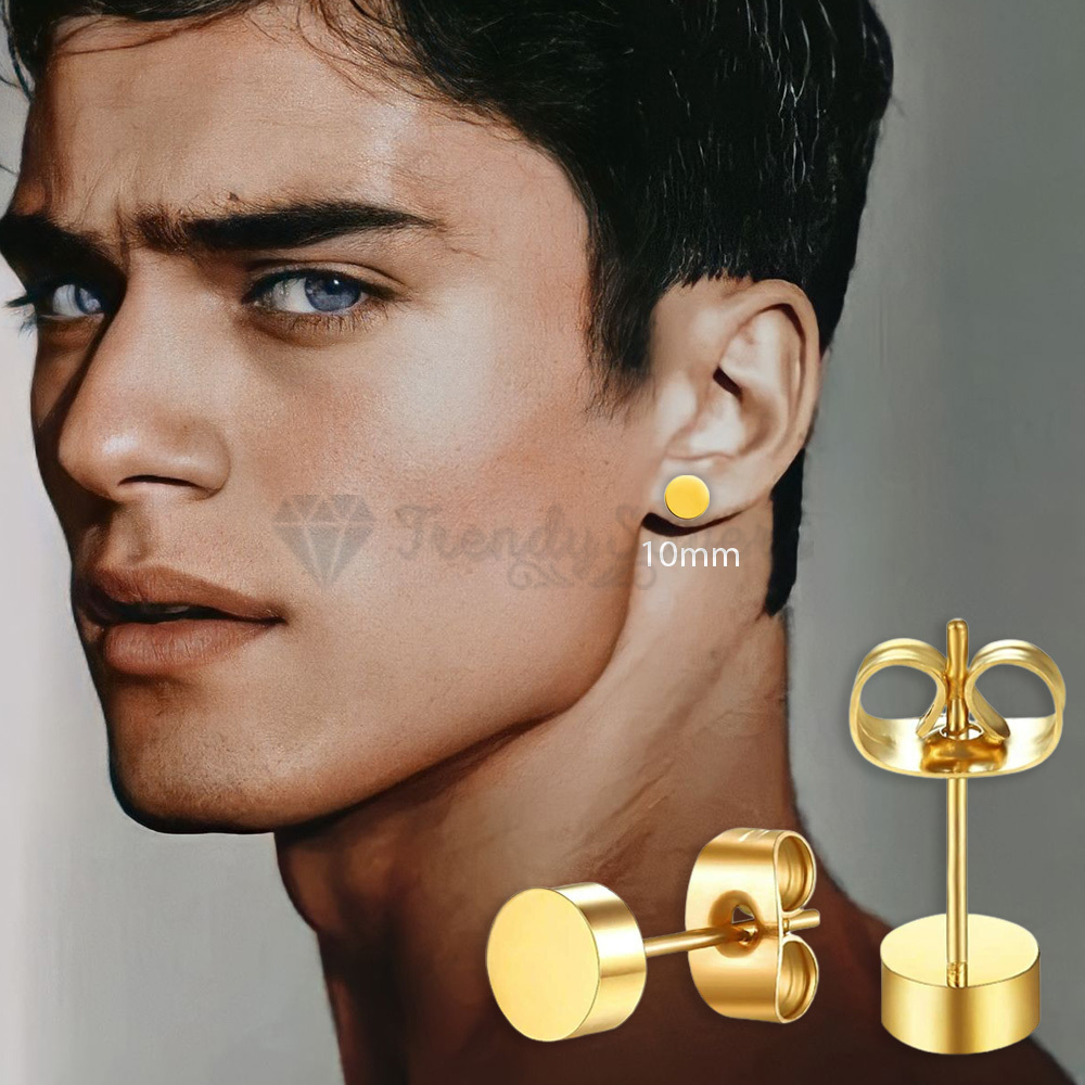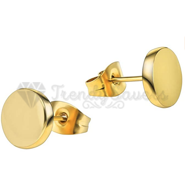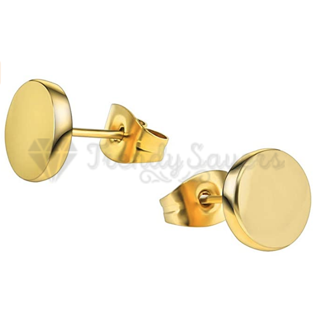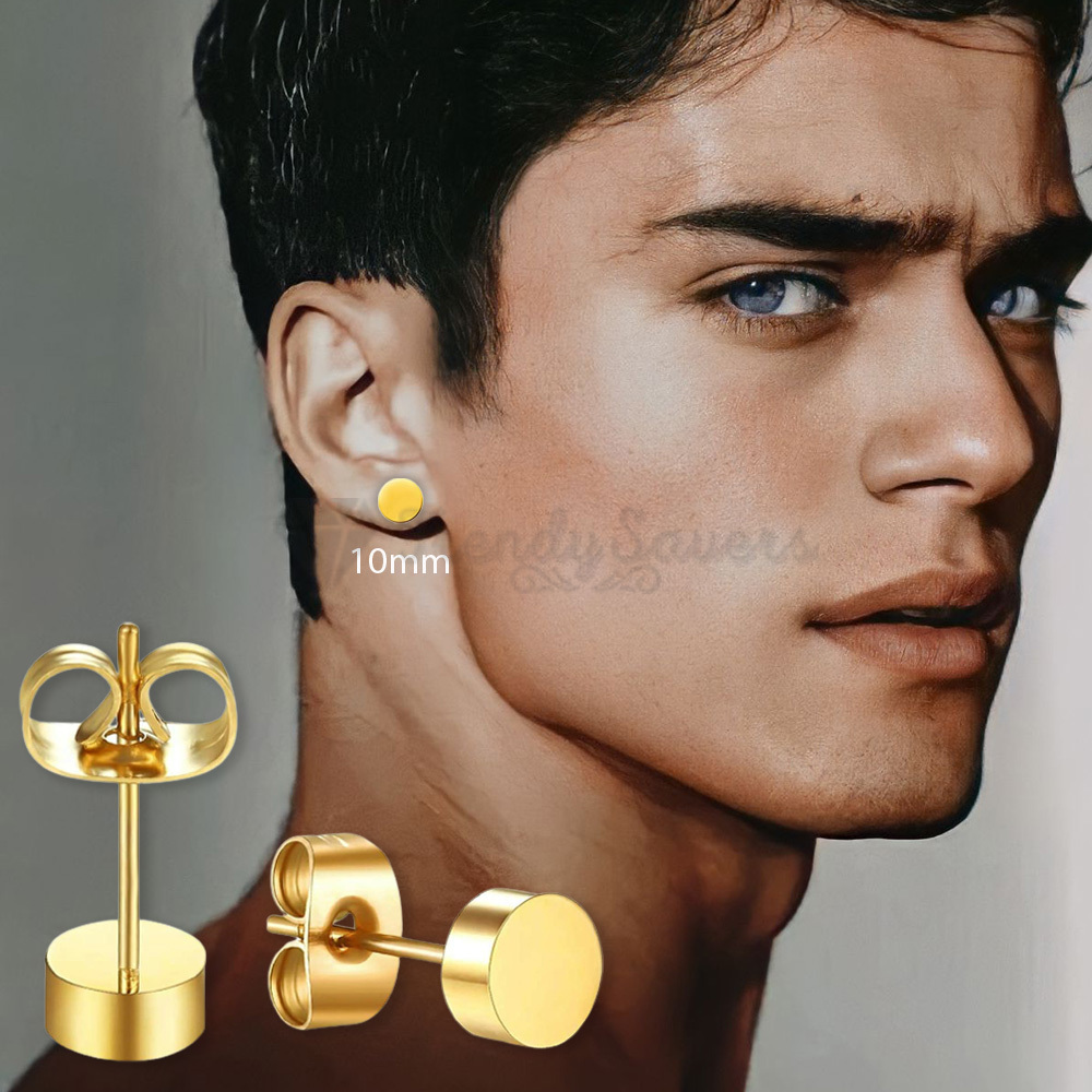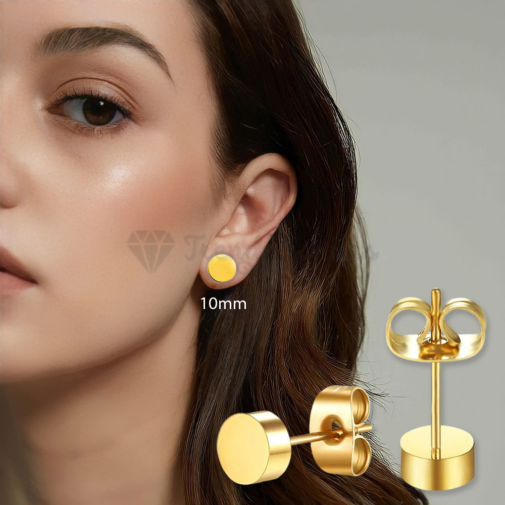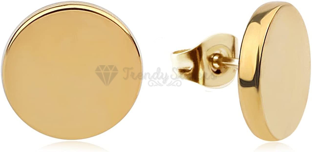 Gold Flat Round Stud Earrings Surgical Stainless Steel 10MM Big Ear Piercing UK