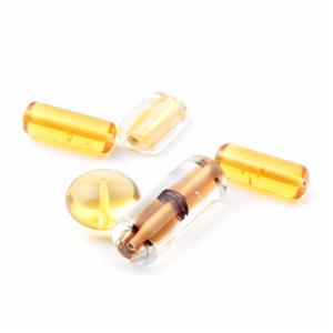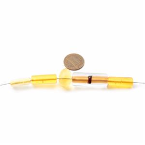(5) vintage rare Czech lampworked amber rondelle and cylinder, gold leaf lined crystal and bicolor lined cylinder art glass beads. Outstanding intricate hand made art glass beads in excellent condition.