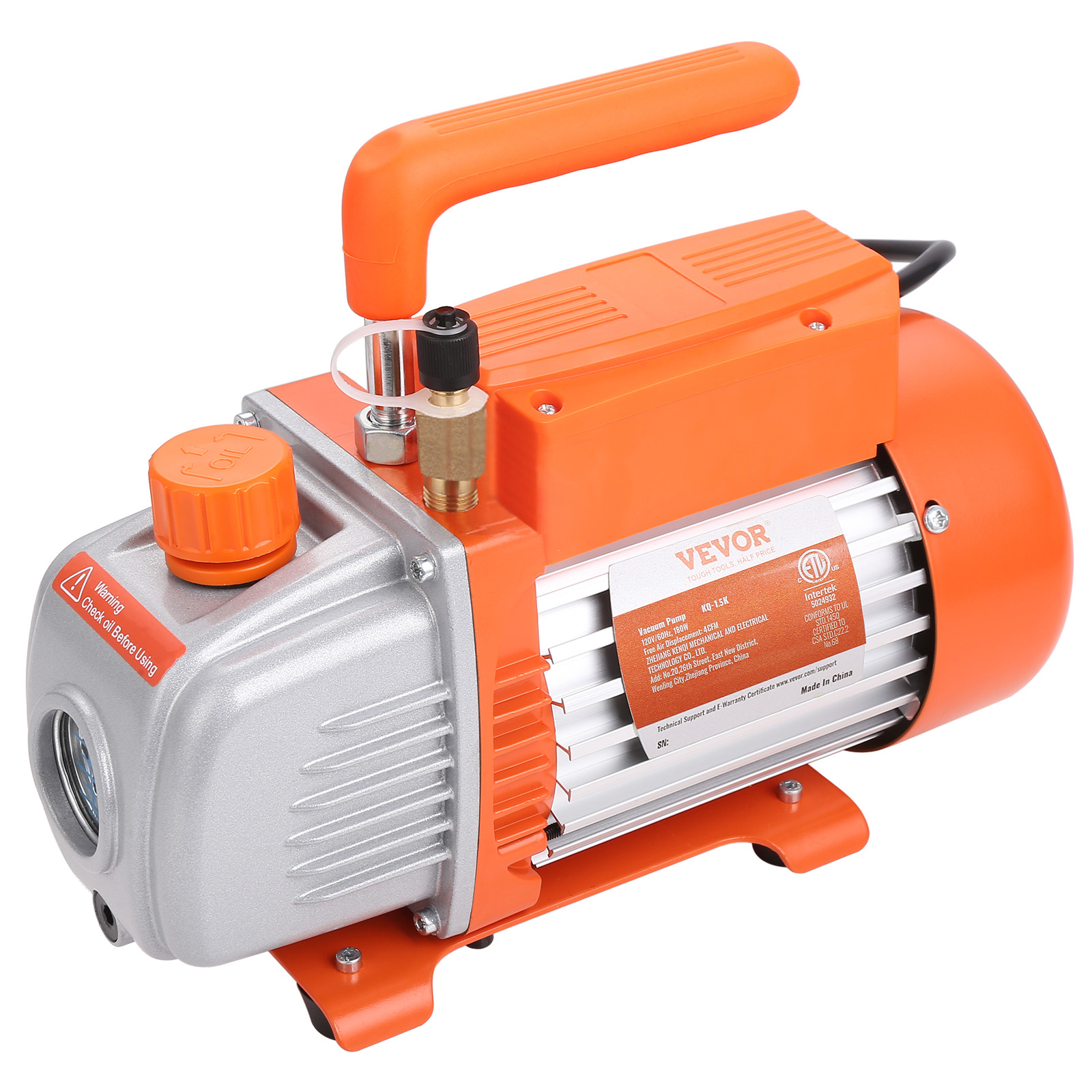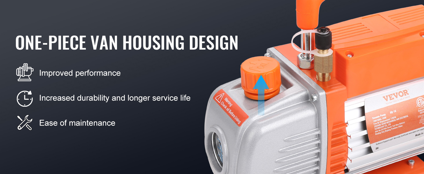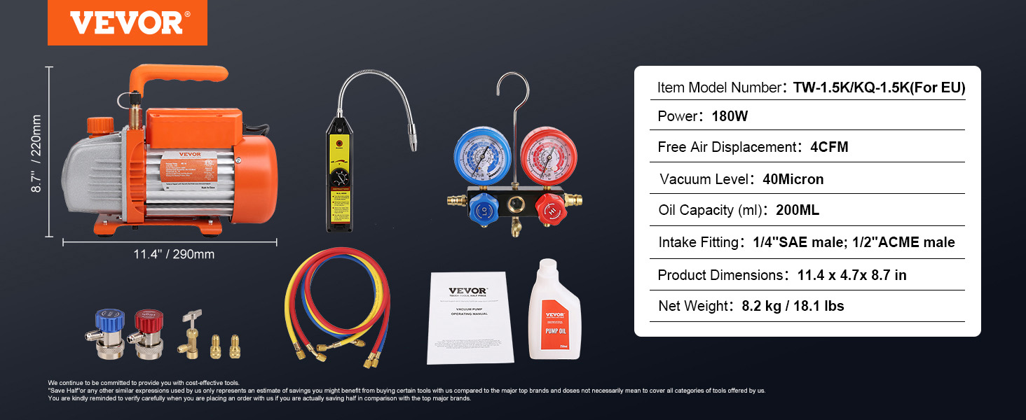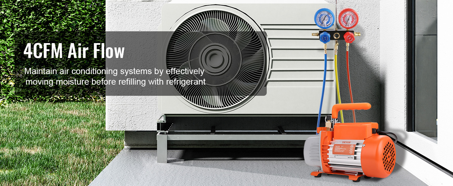 - Heavy Duty Vacuum Pump: Single-stage pump is designed for higher and more stable ultimate vacuum. It maintains the air conditioning system by effectively moving moisture before refilling it with refrigerant. Free Air Displacement: 4 CFM, Ultimate Vacuum: 40 microns, Intake Fitting: 1/4"SAE male and 1/2"ACME male, Speed: 1720PRM, Voltage/Frequency: 120V/60 Hz, Power: 180W, Oil Capacity: 200 ml.