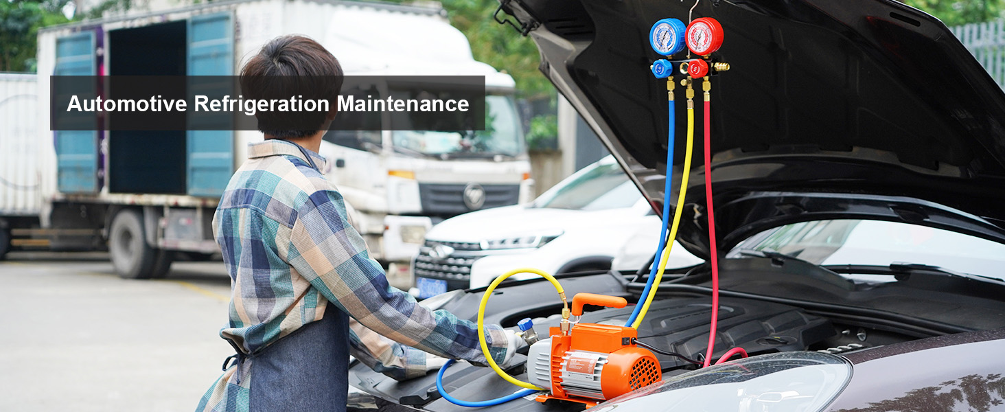 The auto ac vacuum pump kit is designed to measure pressure in refrigeration equipment and extract gas to obtain a vacuum, meeting high vacuum standards. Suitable for HVAC maintenance and automotive refrigeration maintenance.