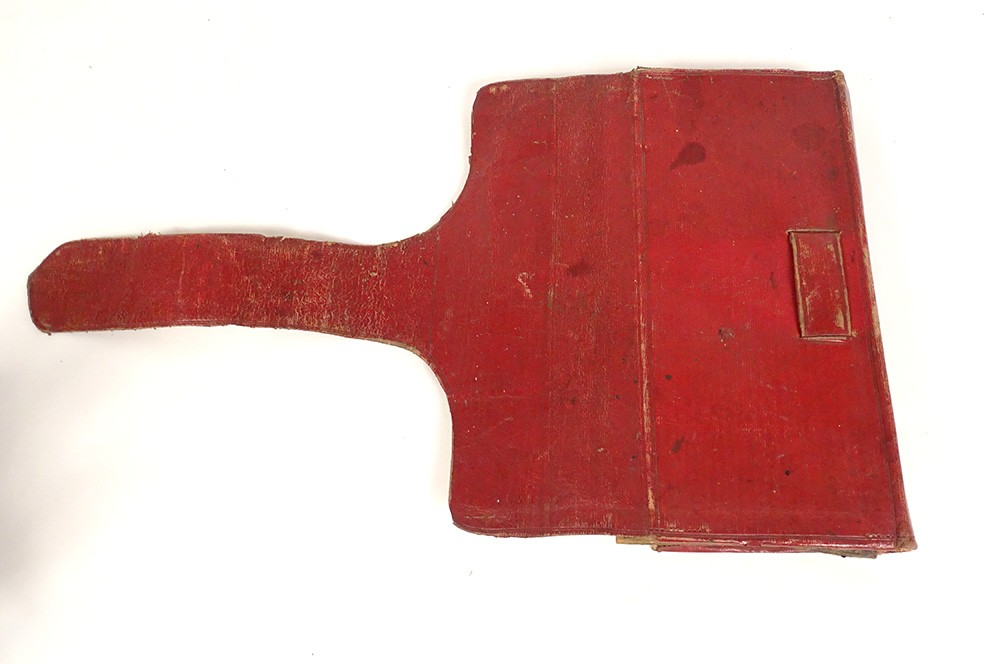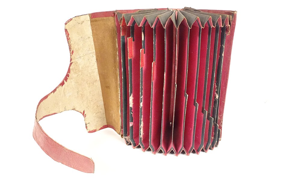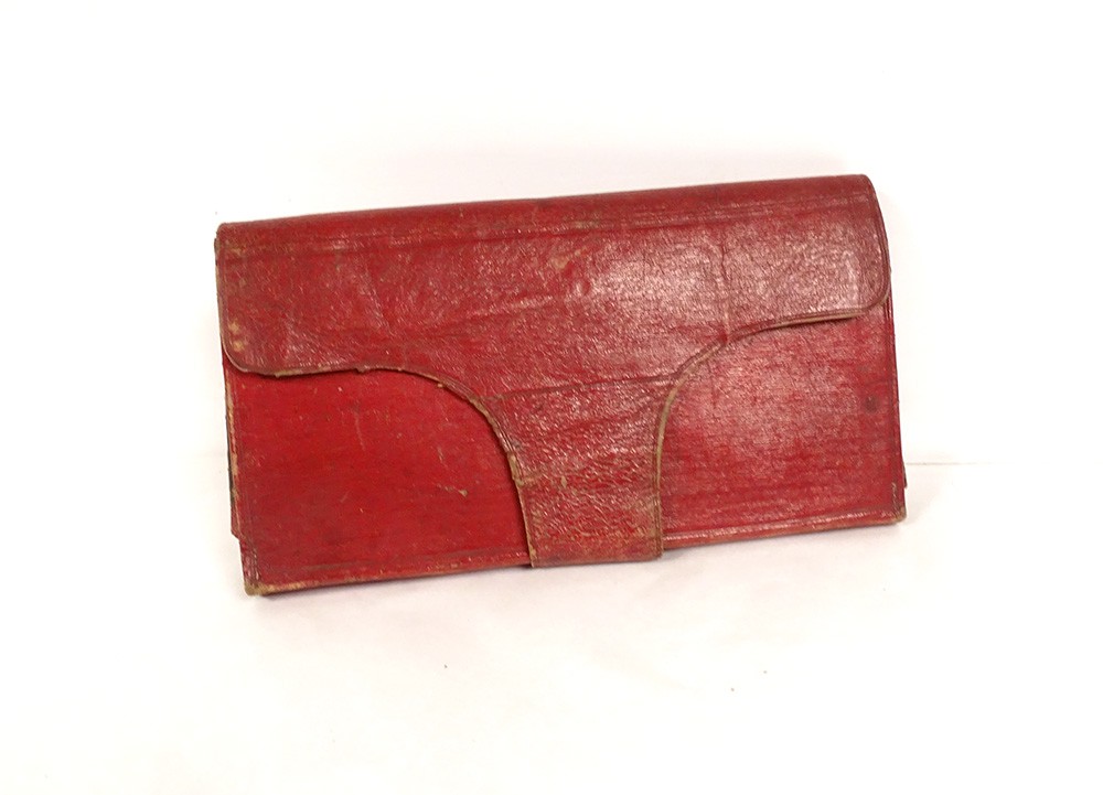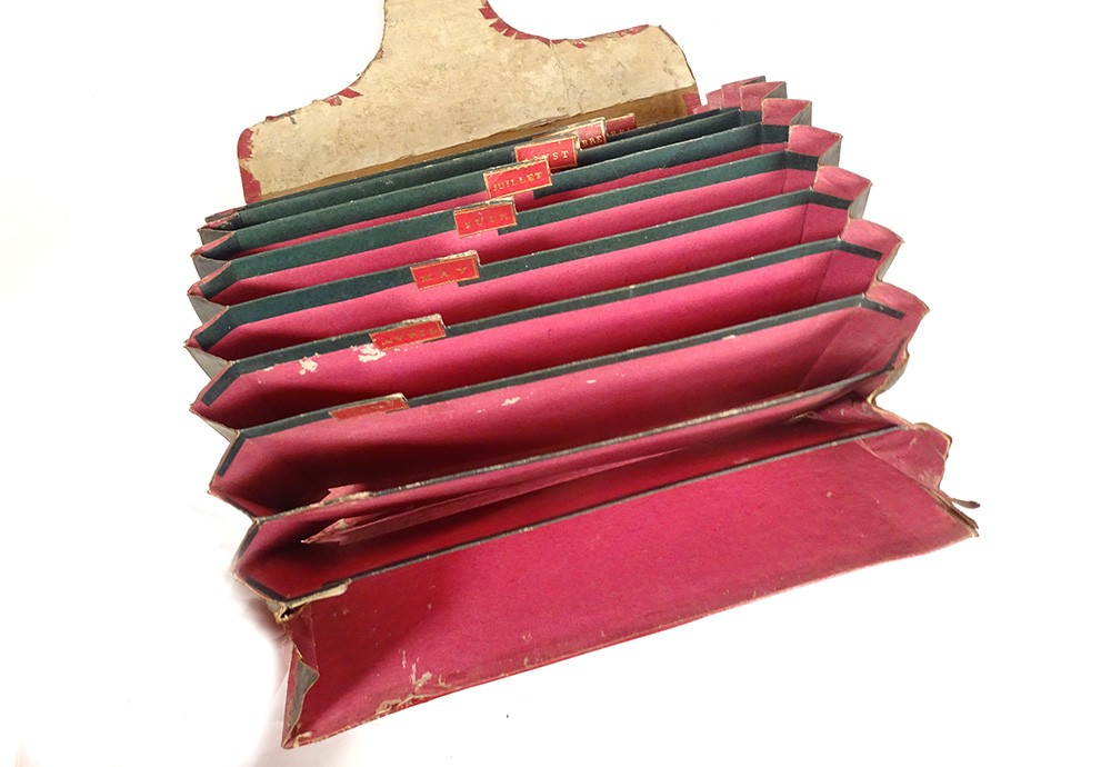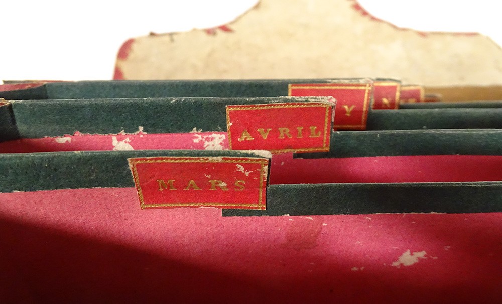 Petite sacoche ou pochette porte-documents à soufflets en cuir maroquin rouge, intérieur à douze compartiments pour les mois de l'année, d'époque milieu XIXème siècle.