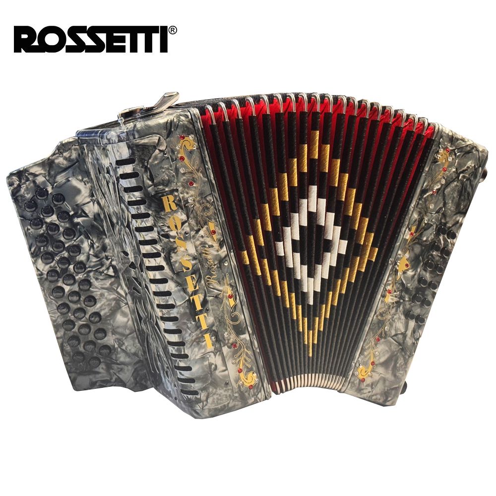 Rossetti accordion with Italian Style Decorations and Pearlescent Color 18 fold bellows for bigger sound. Sheepskin corners for longer life.